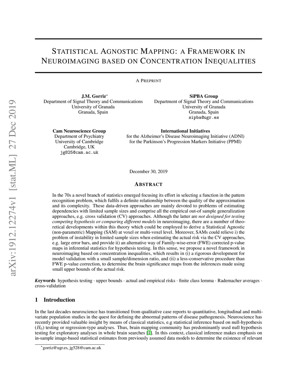 In the 70s a novel branch of statistics emerged focusing its effort in selecting a function in the pattern recognition problem, which fulfils a definite relationship between the quality of the approximation and its complexity. These data-driven approaches are mainly devoted to problems of estimating dependencies with limited sample sizes and comprise all the empirical out-of sample generalization approaches, e.g. cross validation (CV) approaches. Although the latter are \emph{not designed for testing competing hypothesis or comparing different models} in neuroimaging, there are a number of theoretical developments within this theory which could be employed to derive a Statistical Agnostic (non-parametric) Mapping (SAM) at voxel or multi-voxel level. Moreover, SAMs could relieve i) the problem of instability in limited sample sizes when estimating the actual risk via the CV approaches, e.g. large error bars, and provide ii) an alternative way of Family-wise-error (FWE) corrected p-value maps in inferential statistics for hypothesis testing. In this sense, we propose a novel framework in neuroimaging based on concentration inequalities, which results in (i) a rigorous development for model validation with a small sample/dimension ratio, and (ii) a less-conservative procedure than FWE p-value correction, to determine the brain significance maps from the inferences made using small upper bounds of the actual risk.