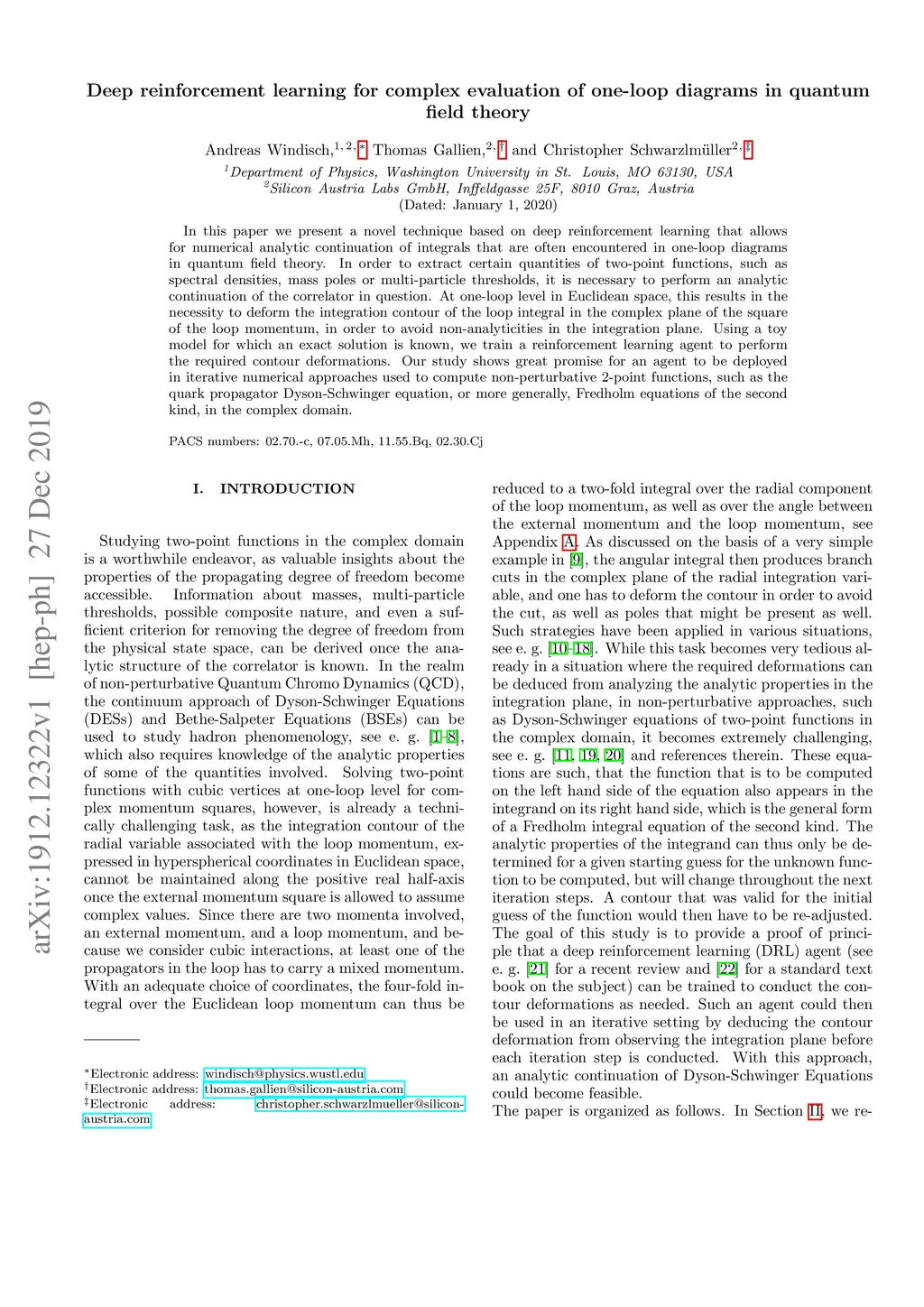 In this paper we present a novel technique based on deep reinforcement learning that allows for numerical analytic continuation of integrals that are often encountered in one-loop diagrams in quantum field theory. In order to extract certain quantities of two-point functions, such as spectral densities, mass poles or multi-particle thresholds, it is necessary to perform an analytic continuation of the correlator in question. At one-loop level in Euclidean space, this results in the necessity to deform the integration contour of the loop integral in the complex plane of the square of the loop momentum, in order to avoid non-analyticities in the integration plane. Using a toy model for which an exact solution is known, we train a reinforcement learning agent to perform the required contour deformations. Our study shows great promise for an agent to be deployed in iterative numerical approaches used to compute non-perturbative 2-point functions, such as the quark propagator Dyson-Schwinger equation, or more generally, Fredholm equations of the second kind, in the complex domain.