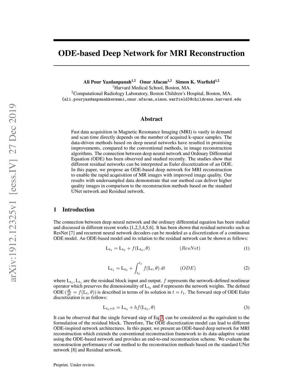 Fast data acquisition in Magnetic Resonance Imaging (MRI) is vastly in demand and scan time directly depends on the number of acquired k-space samples. The data-driven methods based on deep neural networks have resulted in promising improvements, compared to the conventional methods, in image reconstruction algorithms. The connection between deep neural network and Ordinary Differential Equation (ODE) has been observed and studied recently. The studies show that different residual networks can be interpreted as Euler discretization of an ODE. In this paper, we propose an ODE-based deep network for MRI reconstruction to enable the rapid acquisition of MR images with improved image quality. Our results with undersampled data demonstrate that our method can deliver higher quality images in comparison to the reconstruction methods based on the standard UNet network and Residual network.
