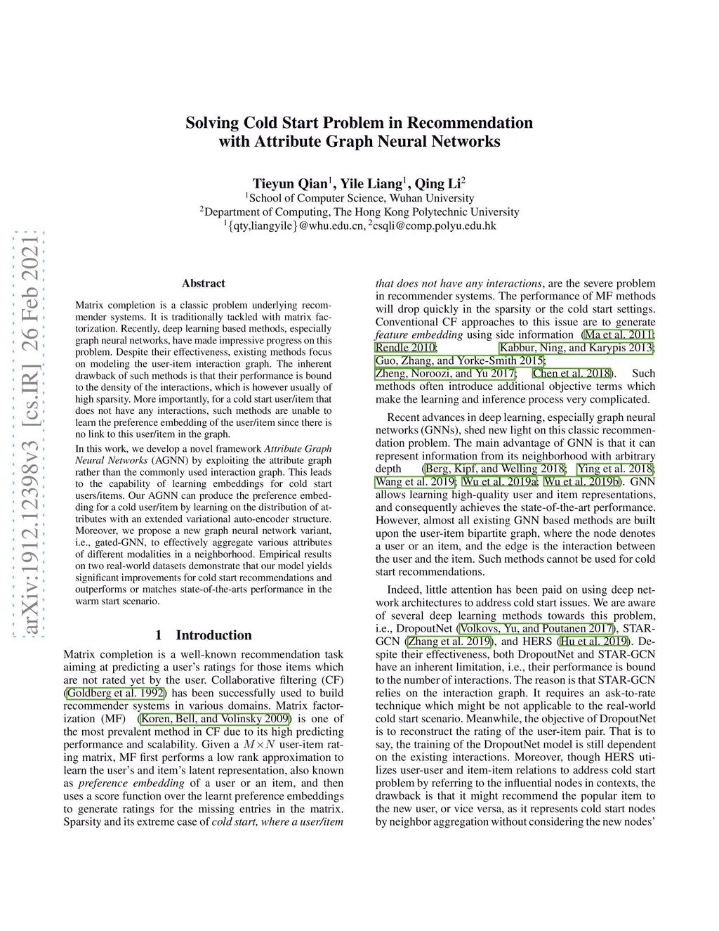 Solving Cold Start Problem in Recommendation with Attribute Graph Neural