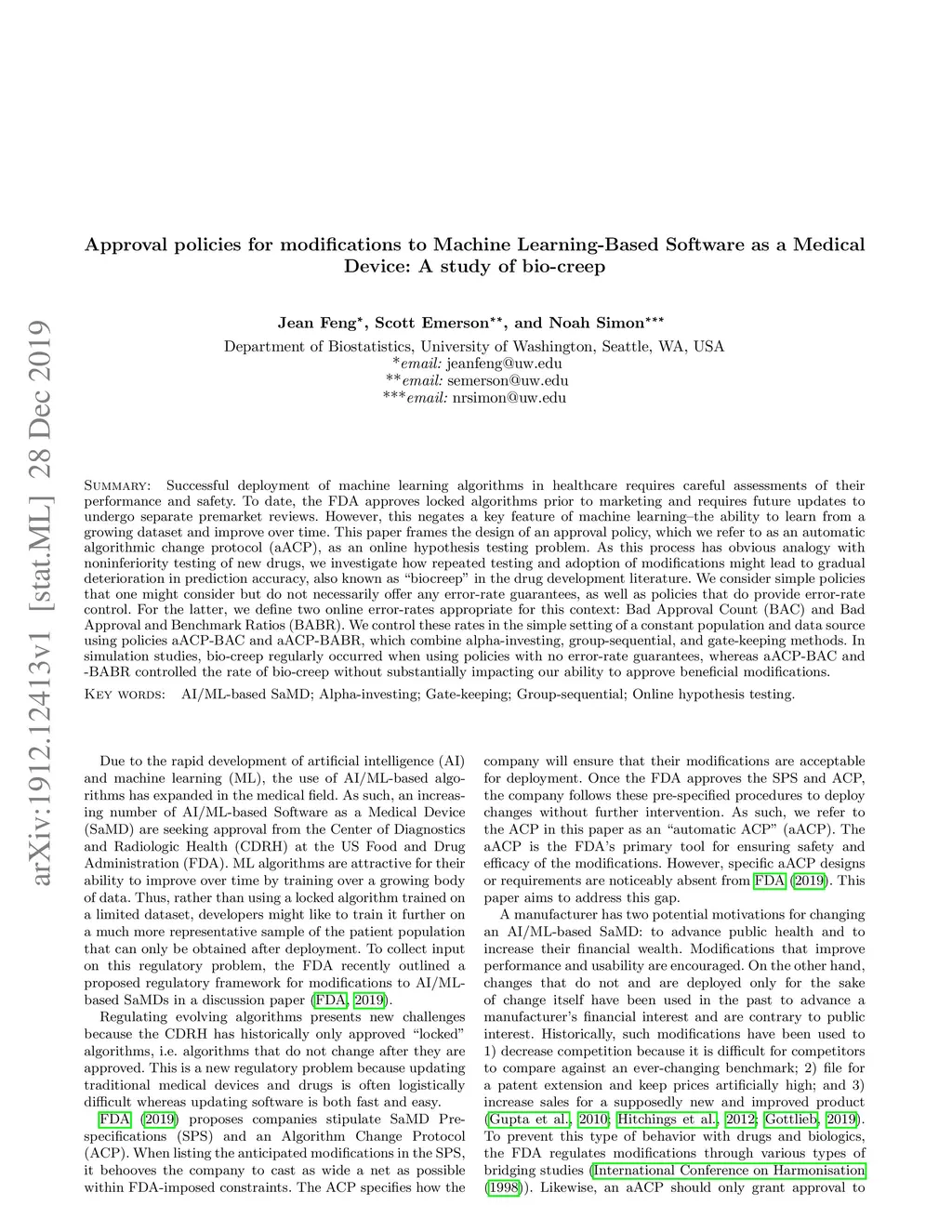 Successful deployment of machine learning algorithms in healthcare requires careful assessments of their performance and safety. To date, the FDA approves locked algorithms prior to marketing and requires future updates to undergo separate premarket reviews. However, this negates a key feature of machine learning--the ability to learn from a growing dataset and improve over time. This paper frames the design of an approval policy, which we refer to as an automatic algorithmic change protocol (aACP), as an online hypothesis testing problem. As this process has obvious analogy with noninferiority testing of new drugs, we investigate how repeated testing and adoption of modifications might lead to gradual deterioration in prediction accuracy, also known as ``biocreep'' in the drug development literature. We consider simple policies that one might consider but do not necessarily offer any error-rate guarantees, as well as policies that do provide error-rate control. For the latter, we define two online error-rates appropriate for this context: Bad Approval Count (BAC) and Bad Approval and Benchmark Ratios (BABR). We control these rates in the simple setting of a constant population and data source using policies aACP-BAC and aACP-BABR, which combine alpha-investing, group-sequential, and gate-keeping methods. In simulation studies, bio-creep regularly occurred when using policies with no error-rate guarantees, whereas aACP-BAC and -BABR controlled the rate of bio-creep without substantially impacting our ability to approve beneficial modifications.