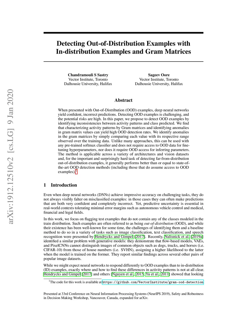 When presented with Out-of-Distribution (OOD) examples, deep neural networks yield confident, incorrect predictions. Detecting OOD examples is challenging, and the potential risks are high. In this paper, we propose to detect OOD examples by identifying inconsistencies between activity patterns and class predicted. We find that characterizing activity patterns by Gram matrices and identifying anomalies in gram matrix values can yield high OOD detection rates. We identify anomalies in the gram matrices by simply comparing each value with its respective range observed over the training data. Unlike many approaches, this can be used with any pre-trained softmax classifier and does not require access to OOD data for fine-tuning hyperparameters, nor does it require OOD access for inferring parameters. The method is applicable across a variety of architectures and vision datasets and, for the important and surprisingly hard task of detecting far-from-distribution out-of-distribution examples, it generally performs better than or equal to state-of-the-art OOD detection methods (including those that do assume access to OOD examples).