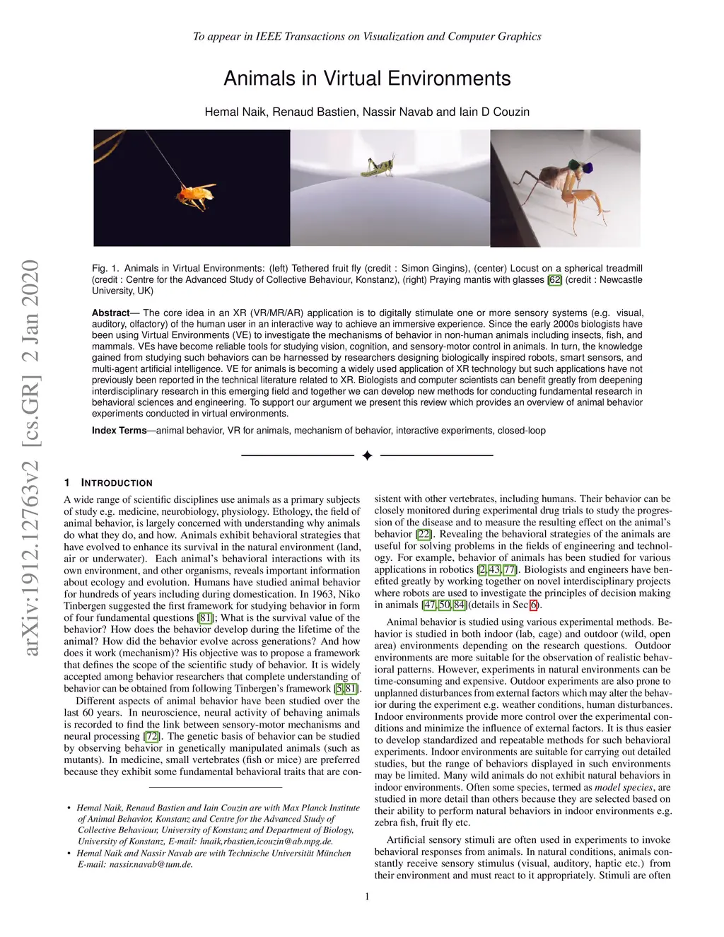 The core idea in an XR (VR/MR/AR) application is to digitally stimulate one or more sensory systems (e.g. visual, auditory, olfactory) of the human user in an interactive way to achieve an immersive experience. Since the early 2000s biologists have been using Virtual Environments (VE) to investigate the mechanisms of behavior in non-human animals including insect, fish, and mammals. VEs have become reliable tools for studying vision, cognition, and sensory-motor control in animals. In turn, the knowledge gained from studying such behaviors can be harnessed by researchers designing biologically inspired robots, smart sensors, and multi-agent artificial intelligence. VE for animals is becoming a widely used application of XR technology but such applications have not previously been reported in the technical literature related to XR. Biologists and computer scientists can benefit greatly from deepening interdisciplinary research in this emerging field and together we can develop new methods for conducting fundamental research in behavioral sciences and engineering. To support our argument we present this review which provides an overview of animal behavior experiments conducted in virtual environments.