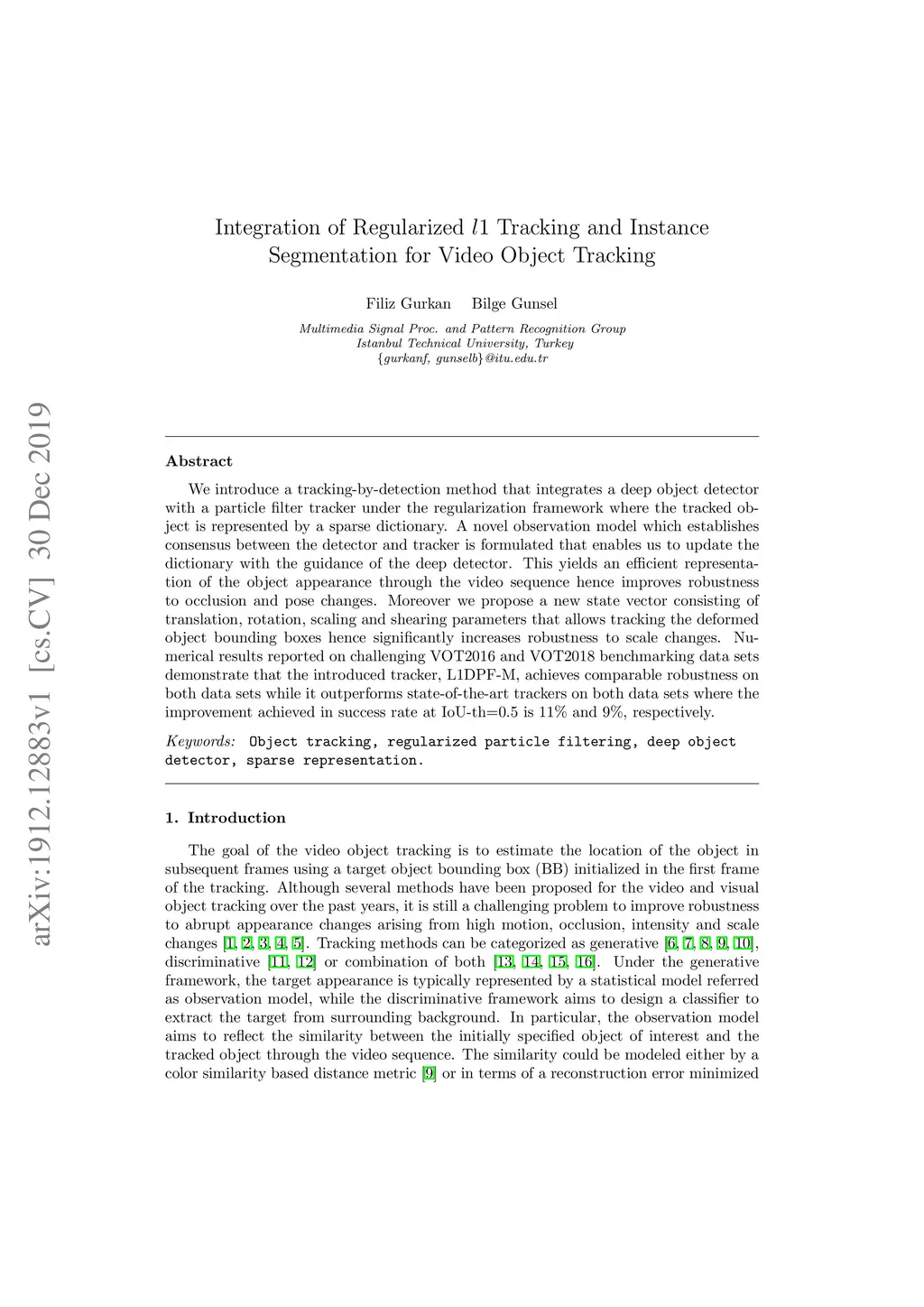 We introduce a tracking-by-detection method that integrates a deep object detector with a particle filter tracker under the regularization framework where the tracked object is represented by a sparse dictionary. A novel observation model which establishes consensus between the detector and tracker is formulated that enables us to update the dictionary with the guidance of the deep detector. This yields an efficient representation of the object appearance through the video sequence hence improves robustness to occlusion and pose changes. Moreover we propose a new state vector consisting of translation, rotation, scaling and shearing parameters that allows tracking the deformed object bounding boxes hence significantly increases robustness to scale changes. Numerical results reported on challenging VOT2016 and VOT2018 benchmarking data sets demonstrate that the introduced tracker, L1DPF-M, achieves comparable robustness on both data sets while it outperforms state-of-the-art trackers on both data sets where the improvement achieved in success rate at IoU-th=0.5 is 11% and 9%, respectively.
