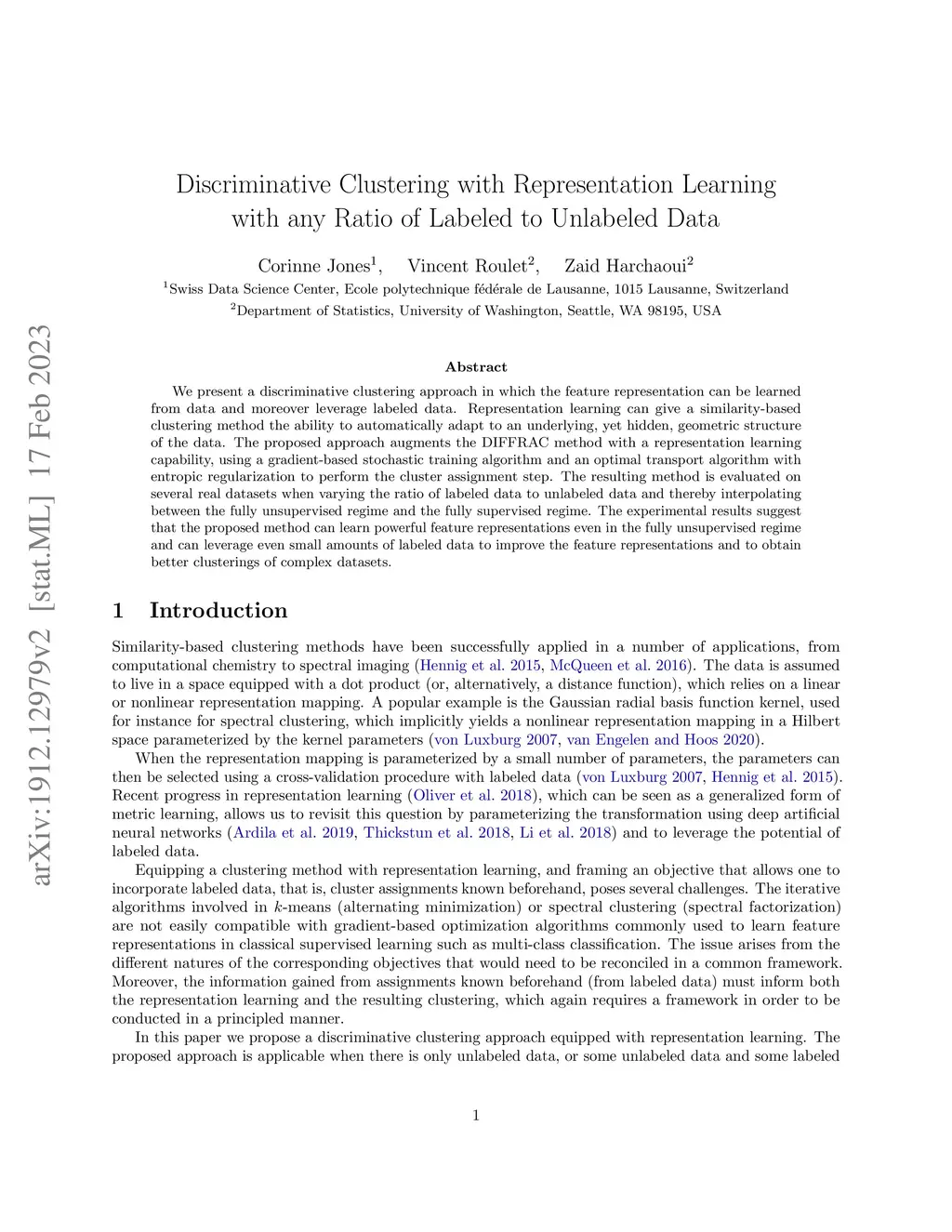 We present a discriminative clustering approach in which the feature representation can be learned from data and moreover leverage labeled data. Representation learning can give a similarity-based clustering method the ability to automatically adapt to an underlying, yet hidden, geometric structure of the data. The proposed approach augments the DIFFRAC method with a representation learning capability, using a gradient-based stochastic training algorithm and an optimal transport algorithm with entropic regularization to perform the cluster assignment step. The resulting method is evaluated on several real datasets when varying the ratio of labeled data to unlabeled data and thereby interpolating between the fully unsupervised regime and the fully supervised regime. The experimental results suggest that the proposed method can learn powerful feature representations even in the fully unsupervised regime and can leverage even small amounts of labeled data to improve the feature representations and to obtain better clusterings of complex datasets.