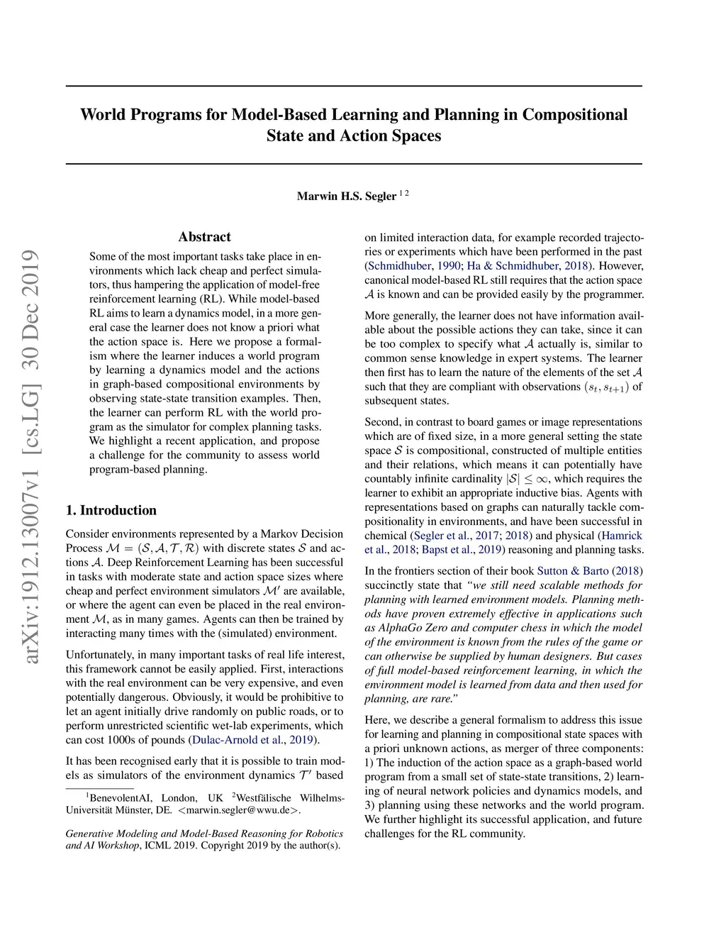 Some of the most important tasks take place in environments which lack cheap and perfect simulators, thus hampering the application of model-free reinforcement learning (RL). While model-based RL aims to learn a dynamics model, in a more general case the learner does not know a priori what the action space is. Here we propose a formalism where the learner induces a world program by learning a dynamics model and the actions in graph-based compositional environments by observing state-state transition examples. Then, the learner can perform RL with the world program as the simulator for complex planning tasks. We highlight a recent application, and propose a challenge for the community to assess world program-based planning.