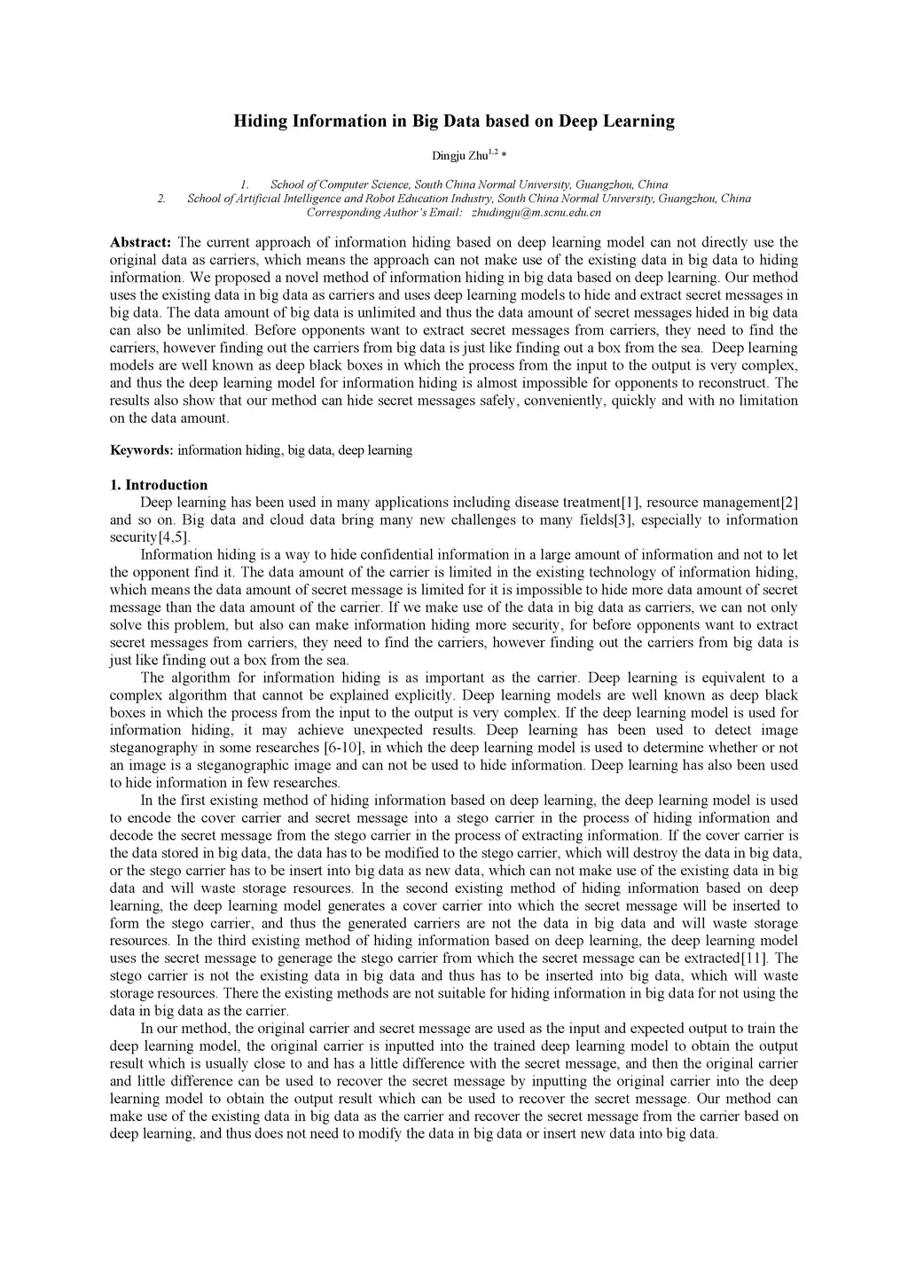 The current approach of information hiding based on deep learning model can not directly use the original data as carriers, which means the approach can not make use of the existing data in big data to hiding information. We proposed a novel method of information hiding in big data based on deep learning. Our method uses the existing data in big data as carriers and uses deep learning models to hide and extract secret messages in big data. The data amount of big data is unlimited and thus the data amount of secret messages hided in big data can also be unlimited. Before opponents want to extract secret messages from carriers, they need to find the carriers, however finding out the carriers from big data is just like finding out a box from the sea. Deep learning models are well known as deep black boxes in which the process from the input to the output is very complex, and thus the deep learning model for information hiding is almost impossible for opponents to reconstruct. The results also show that our method can hide secret messages safely, conveniently, quickly and with no limitation on the data amount.