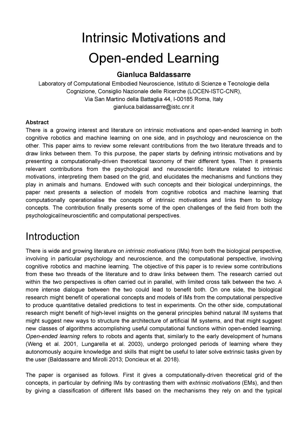 There is a growing interest and literature on intrinsic motivations and open-ended learning in both cognitive robotics and machine learning on one side, and in psychology and neuroscience on the other. This paper aims to review some relevant contributions from the two literature threads and to draw links between them. To this purpose, the paper starts by defining intrinsic motivations and by presenting a computationally-driven theoretical taxonomy of their different types. Then it presents relevant contributions from the psychological and neuroscientific literature related to intrinsic motivations, interpreting them based on the grid, and elucidates the mechanisms and functions they play in animals and humans. Endowed with such concepts and their biological underpinnings, the paper next presents a selection of models from cognitive robotics and machine learning that computationally operationalise the concepts of intrinsic motivations and links them to biology concepts. The contribution finally presents some of the open challenges of the field from both the psychological/neuroscientific and computational perspectives.