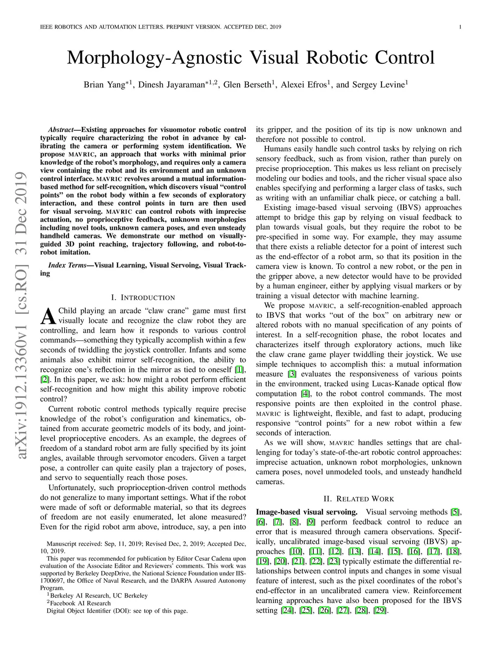 Existing approaches for visuomotor robotic control typically require characterizing the robot in advance by calibrating the camera or performing system identification. We propose MAVRIC, an approach that works with minimal prior knowledge of the robot's morphology, and requires only a camera view containing the robot and its environment and an unknown control interface. MAVRIC revolves around a mutual information-based method for self-recognition, which discovers visual "control points" on the robot body within a few seconds of exploratory interaction, and these control points in turn are then used for visual servoing. MAVRIC can control robots with imprecise actuation, no proprioceptive feedback, unknown morphologies including novel tools, unknown camera poses, and even unsteady handheld cameras. We demonstrate our method on visually-guided 3D point reaching, trajectory following, and robot-to-robot imitation.