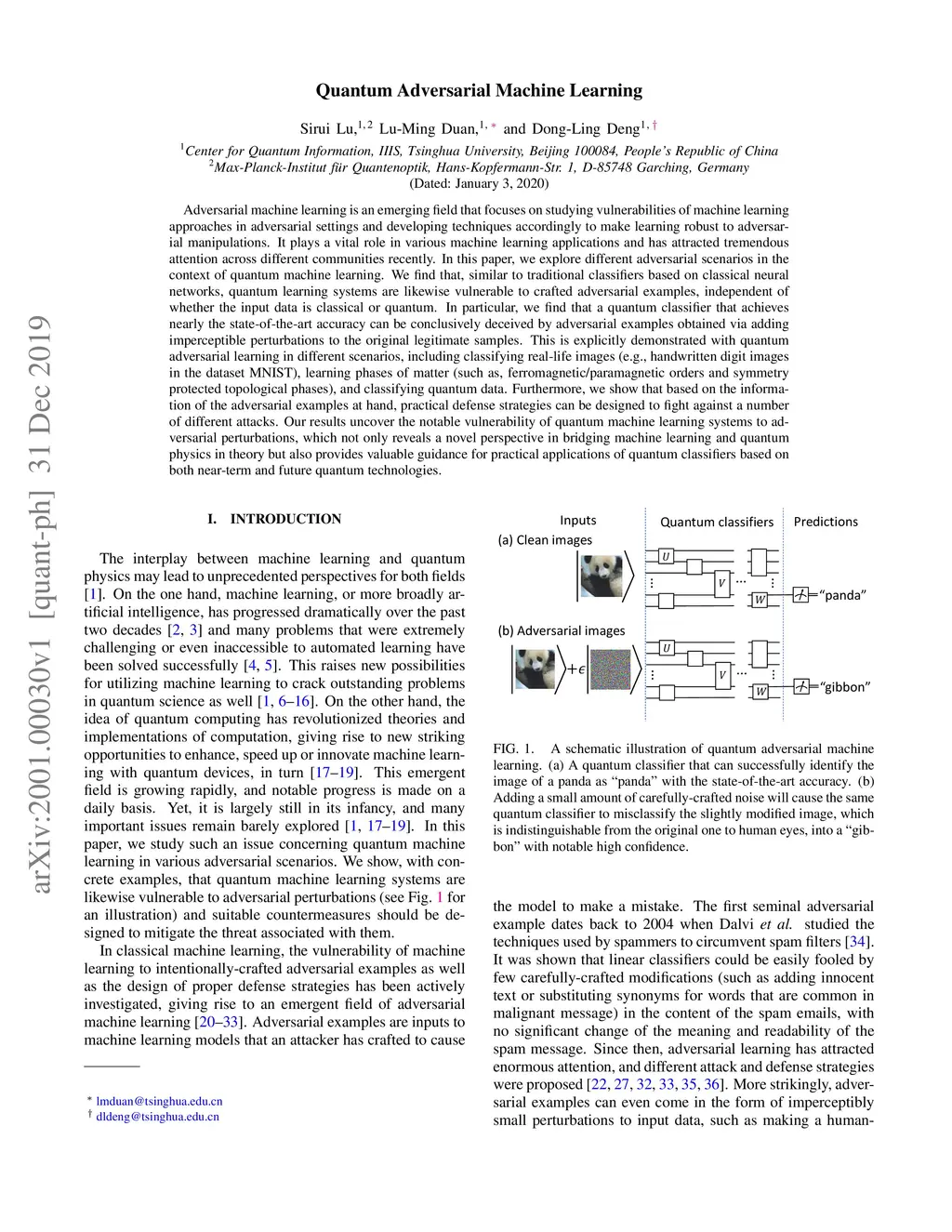 Adversarial machine learning is an emerging field that focuses on studying vulnerabilities of machine learning approaches in adversarial settings and developing techniques accordingly to make learning robust to adversarial manipulations. It plays a vital role in various machine learning applications and has attracted tremendous attention across different communities recently. In this paper, we explore different adversarial scenarios in the context of quantum machine learning. We find that, similar to traditional classifiers based on classical neural networks, quantum learning systems are likewise vulnerable to crafted adversarial examples, independent of whether the input data is classical or quantum. In particular, we find that a quantum classifier that achieves nearly the state-of-the-art accuracy can be conclusively deceived by adversarial examples obtained via adding imperceptible perturbations to the original legitimate samples. This is explicitly demonstrated with quantum adversarial learning in different scenarios, including classifying real-life images (e.g., handwritten digit images in the dataset MNIST), learning phases of matter (such as, ferromagnetic/paramagnetic orders and symmetry protected topological phases), and classifying quantum data. Furthermore, we show that based on the information of the adversarial examples at hand, practical defense strategies can be designed to fight against a number of different attacks. Our results uncover the notable vulnerability of quantum machine learning systems to adversarial perturbations, which not only reveals a novel perspective in bridging machine learning and quantum physics in theory but also provides valuable guidance for practical applications of quantum classifiers based on both near-term and future quantum technologies.
