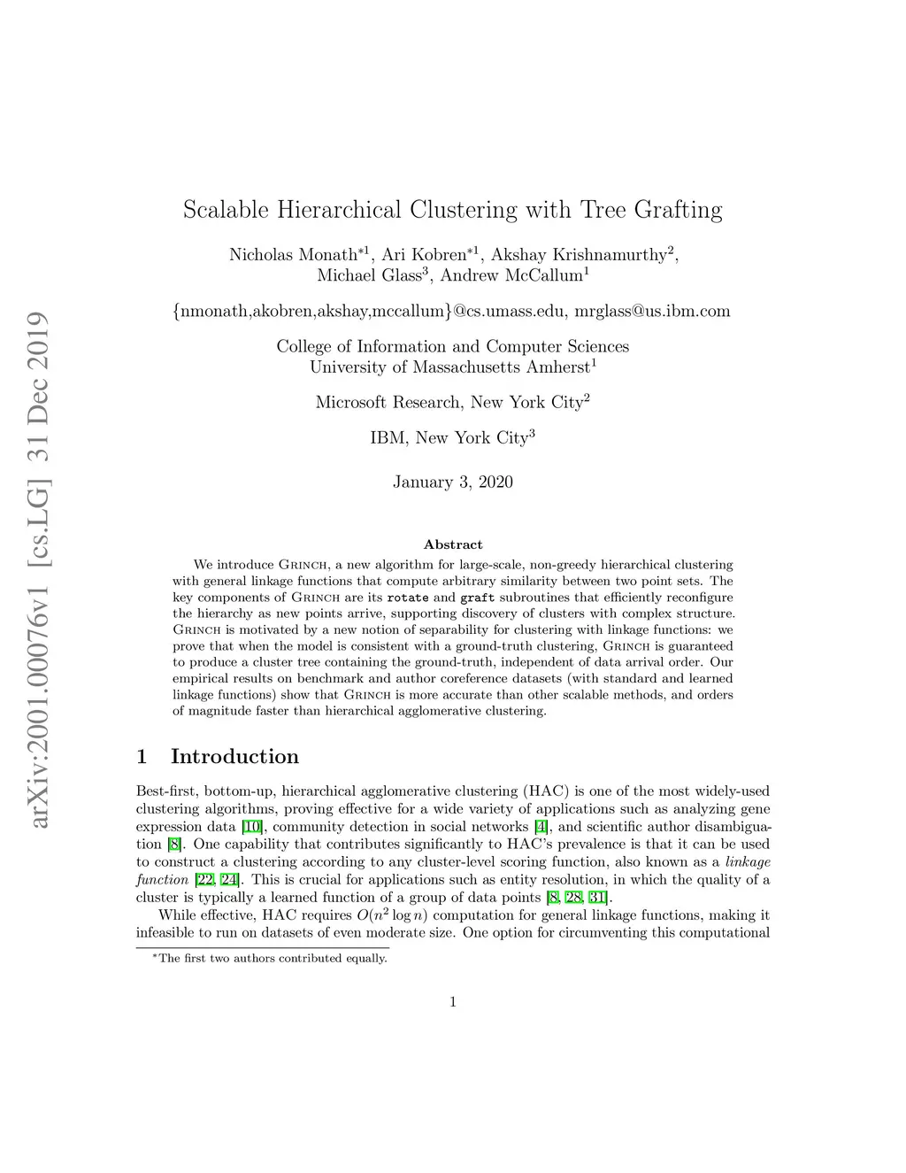 We introduce Grinch, a new algorithm for large-scale, non-greedy hierarchical clustering with general linkage functions that compute arbitrary similarity between two point sets. The key components of Grinch are its rotate and graft subroutines that efficiently reconfigure the hierarchy as new points arrive, supporting discovery of clusters with complex structure. Grinch is motivated by a new notion of separability for clustering with linkage functions: we prove that when the model is consistent with a ground-truth clustering, Grinch is guaranteed to produce a cluster tree containing the ground-truth, independent of data arrival order. Our empirical results on benchmark and author coreference datasets (with standard and learned linkage functions) show that Grinch is more accurate than other scalable methods, and orders of magnitude faster than hierarchical agglomerative clustering.