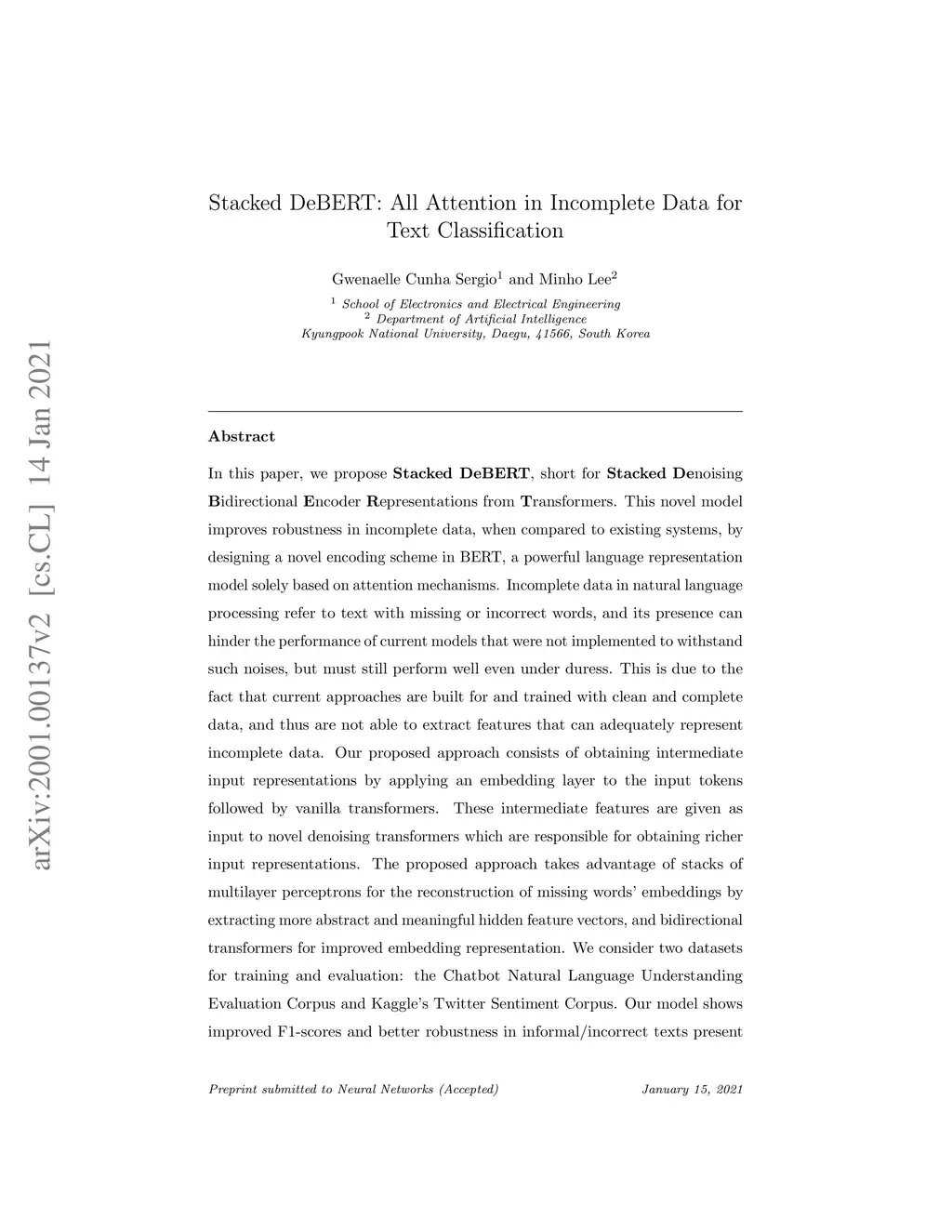 Stacked DeBERT: All Attention in Incomplete Data for Text Classification