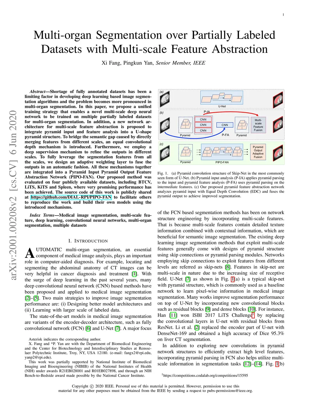 Shortage of fully annotated datasets has been a limiting factor in developing deep learning based image segmentation algorithms and the problem becomes more pronounced in multi-organ segmentation. In this paper, we propose a unified training strategy that enables a novel multi-scale deep neural network to be trained on multiple partially labeled datasets for multi-organ segmentation. In addition, a new network architecture for multi-scale feature abstraction is proposed to integrate pyramid input and feature analysis into a U-shape pyramid structure. To bridge the semantic gap caused by directly merging features from different scales, an equal convolutional depth mechanism is introduced. Furthermore, we employ a deep supervision mechanism to refine the outputs in different scales. To fully leverage the segmentation features from all the scales, we design an adaptive weighting layer to fuse the outputs in an automatic fashion. All these mechanisms together are integrated into a Pyramid Input Pyramid Output Feature Abstraction Network (PIPO-FAN). Our proposed method was evaluated on four publicly available datasets, including BTCV, LiTS, KiTS and Spleen, where very promising performance has been achieved. The source code of this work is publicly shared at https://github.com/DIAL-RPI/PIPO-FAN for others to easily reproduce the work and build their own models with the introduced mechanisms.