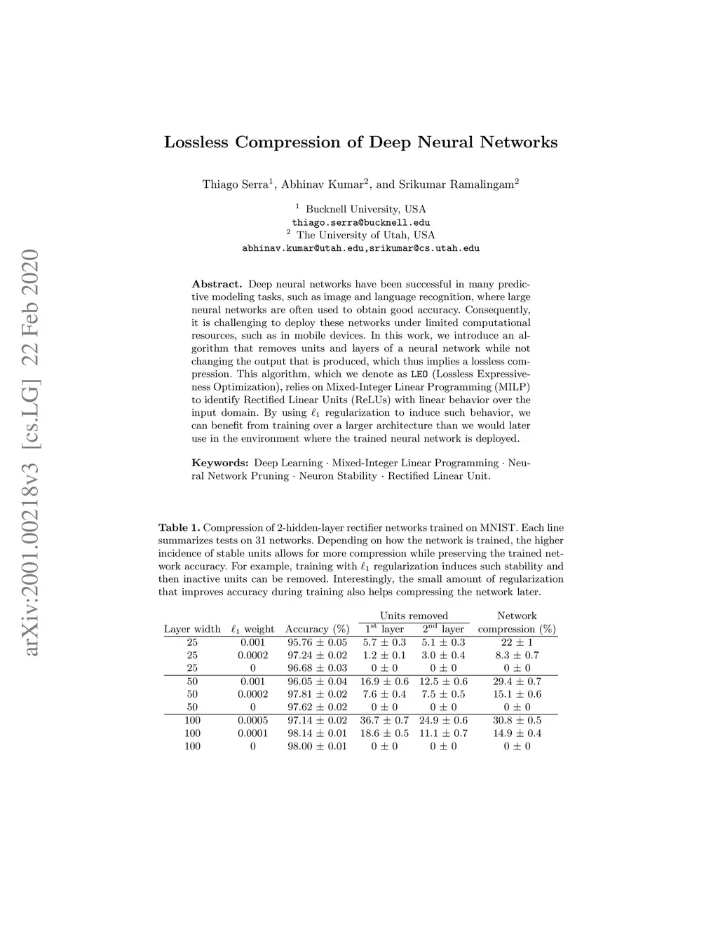 Deep neural networks have been successful in many predictive modeling tasks, such as image and language recognition, where large neural networks are often used to obtain good accuracy. Consequently, it is challenging to deploy these networks under limited computational resources, such as in mobile devices. In this work, we introduce an algorithm that removes units and layers of a neural network while not changing the output that is produced, which thus implies a lossless compression. This algorithm, which we denote as LEO (Lossless Expressiveness Optimization), relies on Mixed-Integer Linear Programming (MILP) to identify Rectified Linear Units (ReLUs) with linear behavior over the input domain. By using L1 regularization to induce such behavior, we can benefit from training over a larger architecture than we would later use in the environment where the trained neural network is deployed.
