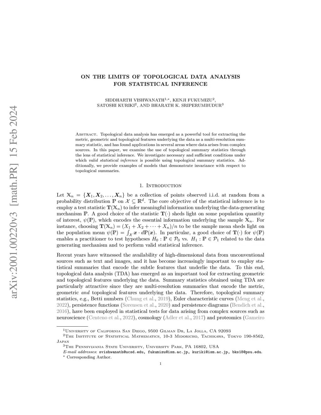 Topological data analysis has emerged as a powerful tool for extracting the metric, geometric and topological features underlying the data as a multi-resolution summary statistic, and has found applications in several areas where data arises from complex sources. In this paper, we examine the use of topological summary statistics through the lens of statistical inference. We investigate necessary and sufficient conditions under which \textit{valid statistical inference} is possible using {topological summary statistics}. Additionally, we provide examples of models that demonstrate invariance with respect to topological summaries.