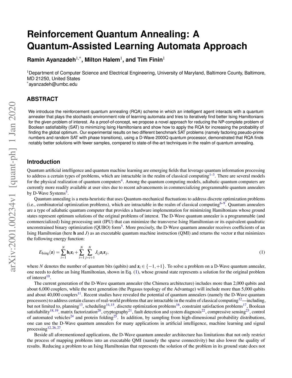 We introduce the reinforcement quantum annealing (RQA) scheme in which an intelligent agent interacts with a quantum annealer that plays the stochastic environment role of learning automata and tries to iteratively find better Ising Hamiltonians for the given problem of interest. As a proof-of-concept, we propose a novel approach for reducing the NP-complete problem of Boolean satisfiability (SAT) to minimizing Ising Hamiltonians and show how to apply the RQA for increasing the probability of finding the global optimum. Our experimental results on two different benchmark SAT problems (namely factoring pseudo-prime numbers and random SAT with phase transitions), using a D-Wave 2000Q quantum processor, demonstrated that RQA finds notably better solutions with fewer samples, compared to state-of-the-art techniques in the realm of quantum annealing.