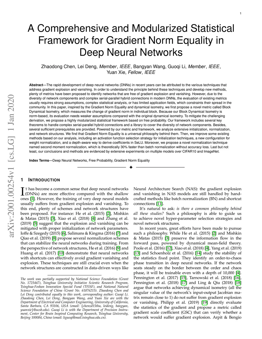 In recent years, plenty of metrics have been proposed to identify networks that are free of gradient explosion and vanishing. However, due to the diversity of network components and complex serial-parallel hybrid connections in modern DNNs, the evaluation of existing metrics usually requires strong assumptions, complex statistical analysis, or has limited application fields, which constraints their spread in the community. In this paper, inspired by the Gradient Norm Equality and dynamical isometry, we first propose a novel metric called Block Dynamical Isometry, which measures the change of gradient norm in individual block. Because our Block Dynamical Isometry is norm-based, its evaluation needs weaker assumptions compared with the original dynamical isometry. To mitigate the challenging derivation, we propose a highly modularized statistical framework based on free probability. Our framework includes several key theorems to handle complex serial-parallel hybrid connections and a library to cover the diversity of network components. Besides, several sufficient prerequisites are provided. Powered by our metric and framework, we analyze extensive initialization, normalization, and network structures. We find that Gradient Norm Equality is a universal philosophy behind them. Then, we improve some existing methods based on our analysis, including an activation function selection strategy for initialization techniques, a new configuration for weight normalization, and a depth-aware way to derive coefficients in SeLU. Moreover, we propose a novel normalization technique named second moment normalization, which is theoretically 30% faster than batch normalization without accuracy loss. Last but not least, our conclusions and methods are evidenced by extensive experiments on multiple models over CIFAR10 and ImageNet.