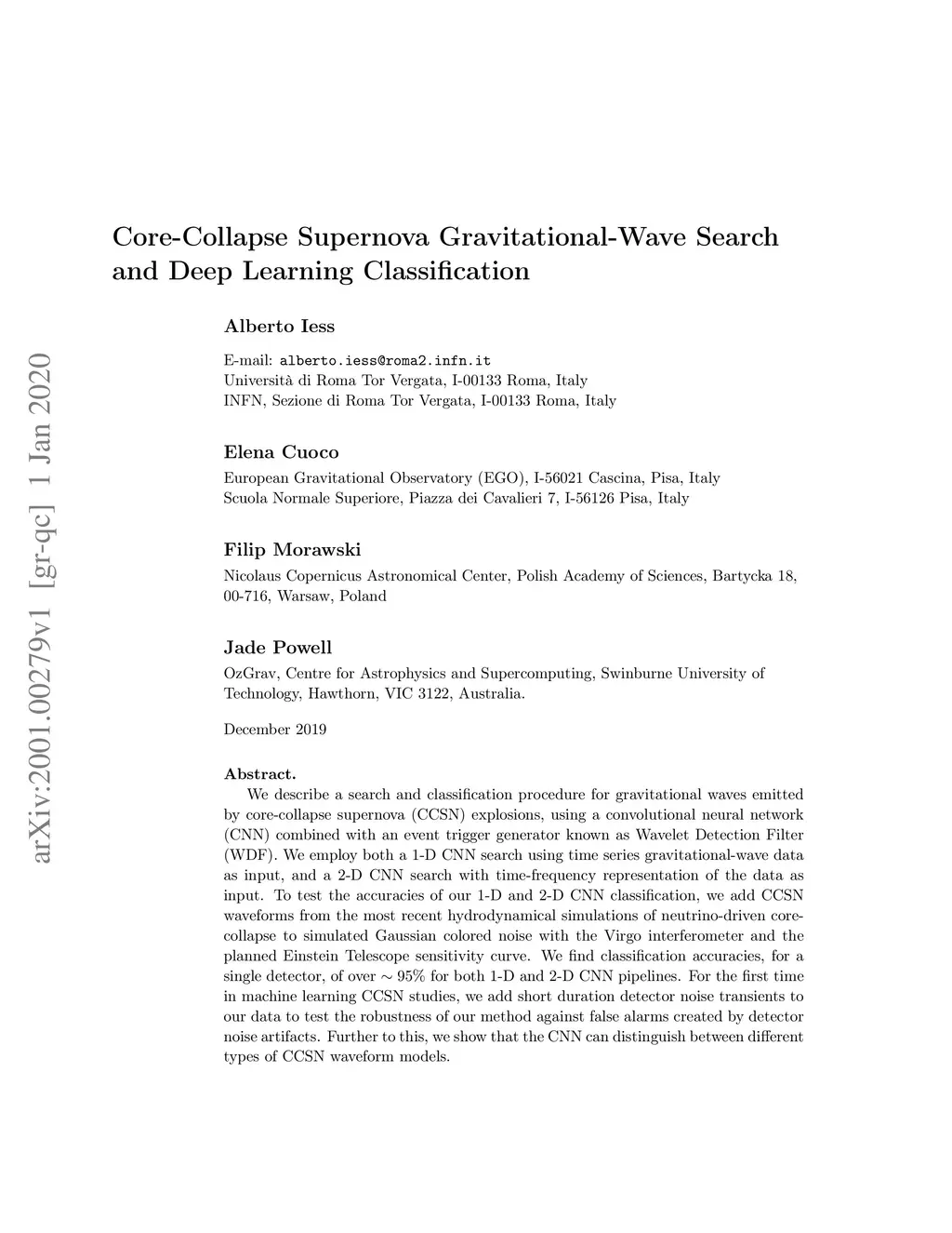We describe a search and classification procedure for gravitational waves emitted by core-collapse supernova (CCSN) explosions, using a convolutional neural network (CNN) combined with an event trigger generator known as Wavelet Detection Filter (WDF). We employ both a 1-D CNN search using time series gravitational-wave data as input, and a 2-D CNN search with time-frequency representation of the data as input. To test the accuracies of our 1-D and 2-D CNN classification, we add CCSN waveforms from the most recent hydrodynamical simulations of neutrino-driven core-collapse to simulated Gaussian colored noise with the Virgo interferometer and the planned Einstein Telescope sensitivity curve. We find classification accuracies, for a single detector, of over 95% for both 1-D and 2-D CNN pipelines. For the first time in machine learning CCSN studies, we add short duration detector noise transients to our data to test the robustness of our method against false alarms created by detector noise artifacts. Further to this, we show that the CNN can distinguish between different types of CCSN waveform models.