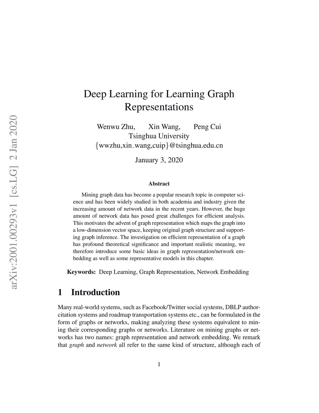 Mining graph data has become a popular research topic in computer science and has been widely studied in both academia and industry given the increasing amount of network data in the recent years. However, the huge amount of network data has posed great challenges for efficient analysis. This motivates the advent of graph representation which maps the graph into a low-dimension vector space, keeping original graph structure and supporting graph inference. The investigation on efficient representation of a graph has profound theoretical significance and important realistic meaning, we therefore introduce some basic ideas in graph representation/network embedding as well as some representative models in this chapter.