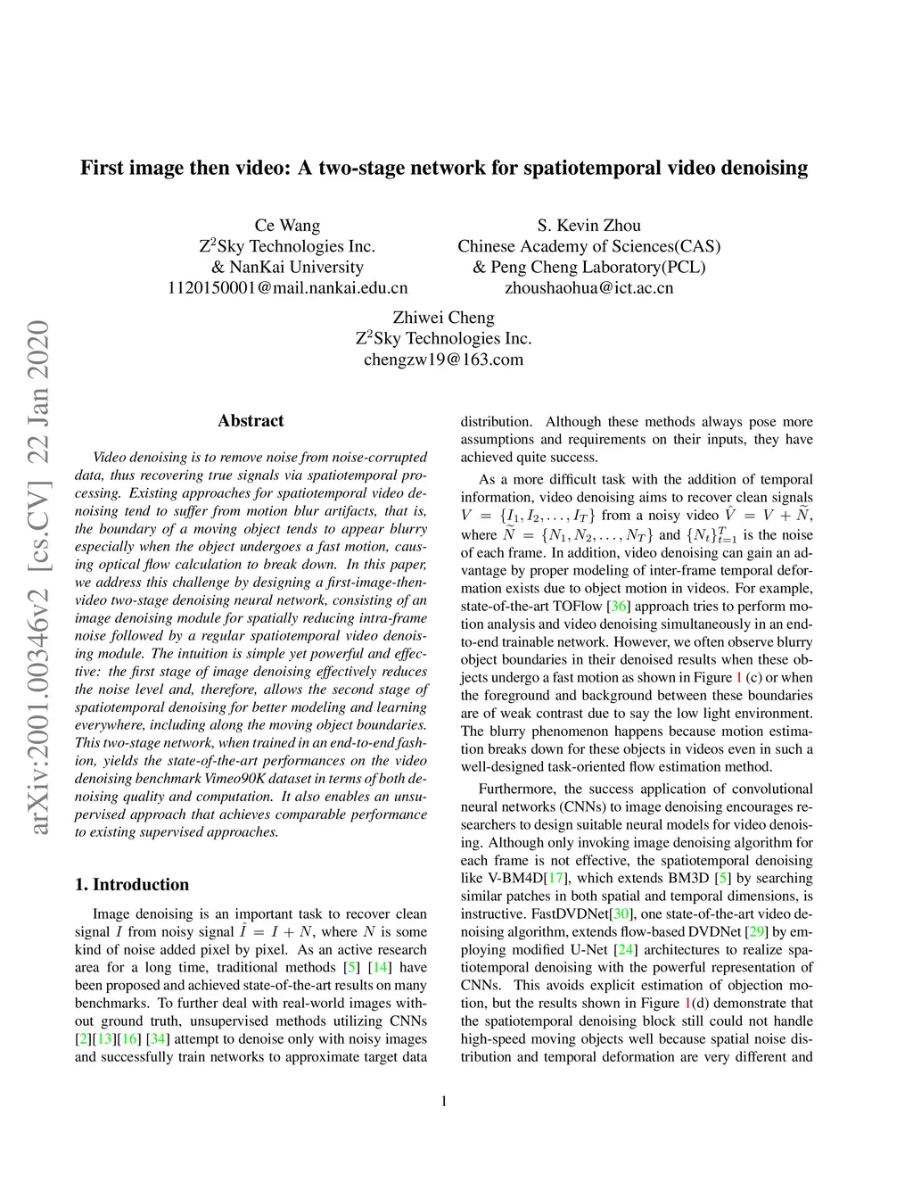 Video denoising is to remove noise from noise-corrupted data, thus recovering true signals via spatiotemporal processing. Existing approaches for spatiotemporal video denoising tend to suffer from motion blur artifacts, that is, the boundary of a moving object tends to appear blurry especially when the object undergoes a fast motion, causing optical flow calculation to break down. In this paper, we address this challenge by designing a first-image-then-video two-stage denoising neural network, consisting of an image denoising module for spatially reducing intra-frame noise followed by a regular spatiotemporal video denoising module. The intuition is simple yet powerful and effective: the first stage of image denoising effectively reduces the noise level and, therefore, allows the second stage of spatiotemporal denoising for better modeling and learning everywhere, including along the moving object boundaries. This two-stage network, when trained in an end-to-end fashion, yields the state-of-the-art performances on the video denoising benchmark Vimeo90K dataset in terms of both denoising quality and computation. It also enables an unsupervised approach that achieves comparable performance to existing supervised approaches.