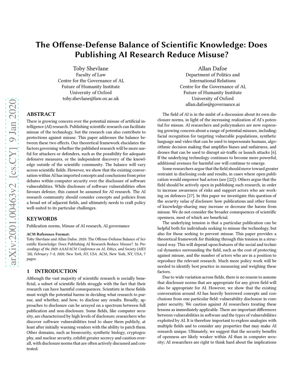 There is growing concern over the potential misuse of artificial intelligence (AI) research. Publishing scientific research can facilitate misuse of the technology, but the research can also contribute to protections against misuse. This paper addresses the balance between these two effects. Our theoretical framework elucidates the factors governing whether the published research will be more useful for attackers or defenders, such as the possibility for adequate defensive measures, or the independent discovery of the knowledge outside of the scientific community. The balance will vary across scientific fields. However, we show that the existing conversation within AI has imported concepts and conclusions from prior debates within computer security over the disclosure of software vulnerabilities. While disclosure of software vulnerabilities often favours defence, this cannot be assumed for AI research. The AI research community should consider concepts and policies from a broad set of adjacent fields, and ultimately needs to craft policy well-suited to its particular challenges.