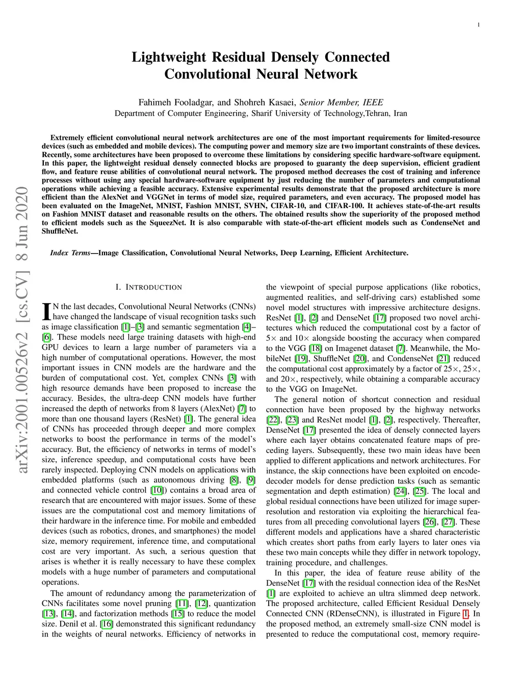 Extremely efficient convolutional neural network architectures are one of the most important requirements for limited-resource devices (such as embedded and mobile devices). The computing power and memory size are two important constraints of these devices. Recently, some architectures have been proposed to overcome these limitations by considering specific hardware-software equipment. In this paper, the lightweight residual densely connected blocks are proposed to guaranty the deep supervision, efficient gradient flow, and feature reuse abilities of convolutional neural network. The proposed method decreases the cost of training and inference processes without using any special hardware-software equipment by just reducing the number of parameters and computational operations while achieving a feasible accuracy. Extensive experimental results demonstrate that the proposed architecture is more efficient than the AlexNet and VGGNet in terms of model size, required parameters, and even accuracy. The proposed model has been evaluated on the ImageNet, MNIST, Fashion MNIST, SVHN, CIFAR-10, and CIFAR-100. It achieves state-of-the-art results on Fashion MNIST dataset and reasonable results on the others. The obtained results show the superiority of the proposed method to efficient models such as the SqueezNet. It is also comparable with state-of-the-art efficient models such as CondenseNet and ShuffleNet.