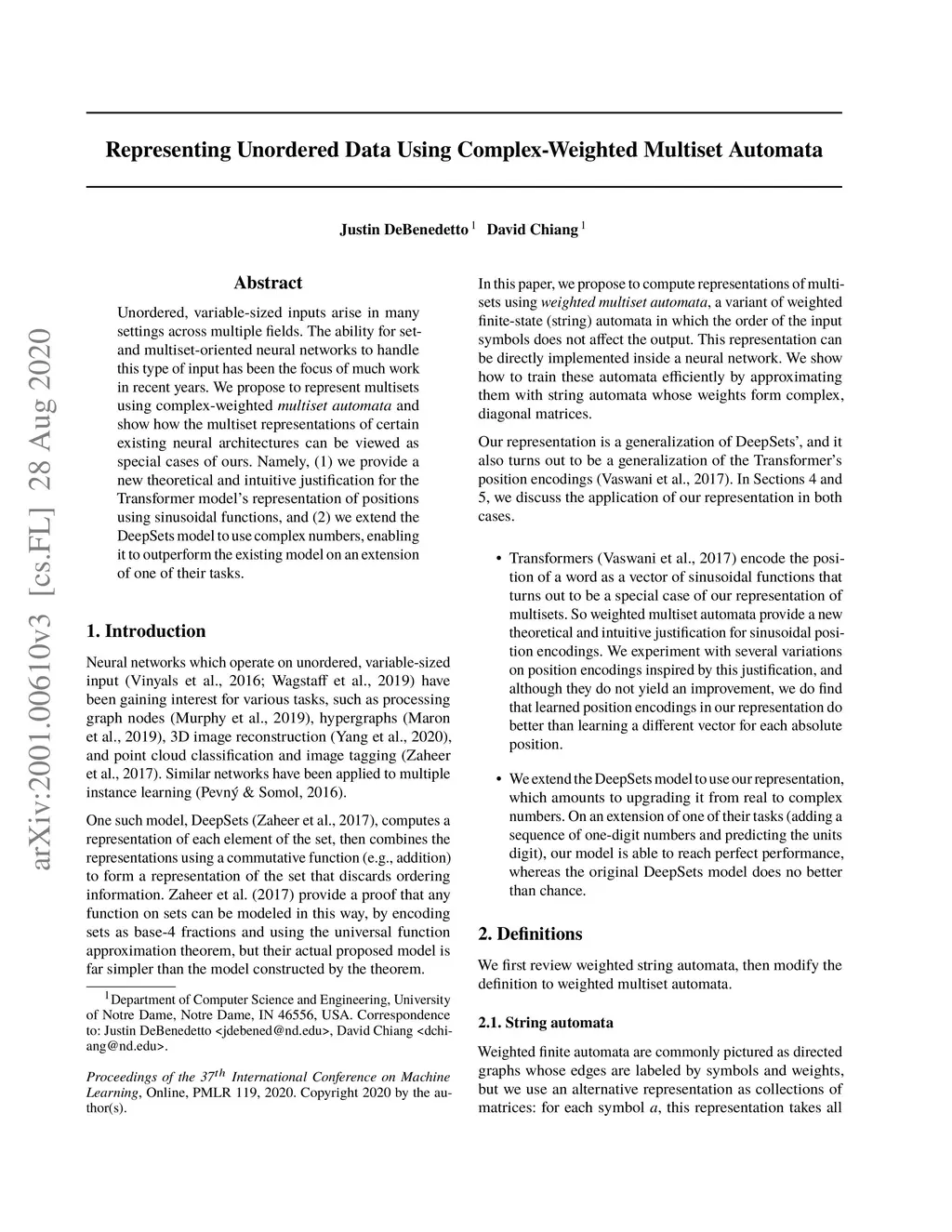 Unordered, variable-sized inputs arise in many settings across multiple fields. The ability for set- and multiset-oriented neural networks to handle this type of input has been the focus of much work in recent years. We propose to represent multisets using complex-weighted multiset automata and show how the multiset representations of certain existing neural architectures can be viewed as special cases of ours. Namely, (1) we provide a new theoretical and intuitive justification for the Transformer model's representation of positions using sinusoidal functions, and (2) we extend the DeepSets model to use complex numbers, enabling it to outperform the existing model on an extension of one of their tasks.