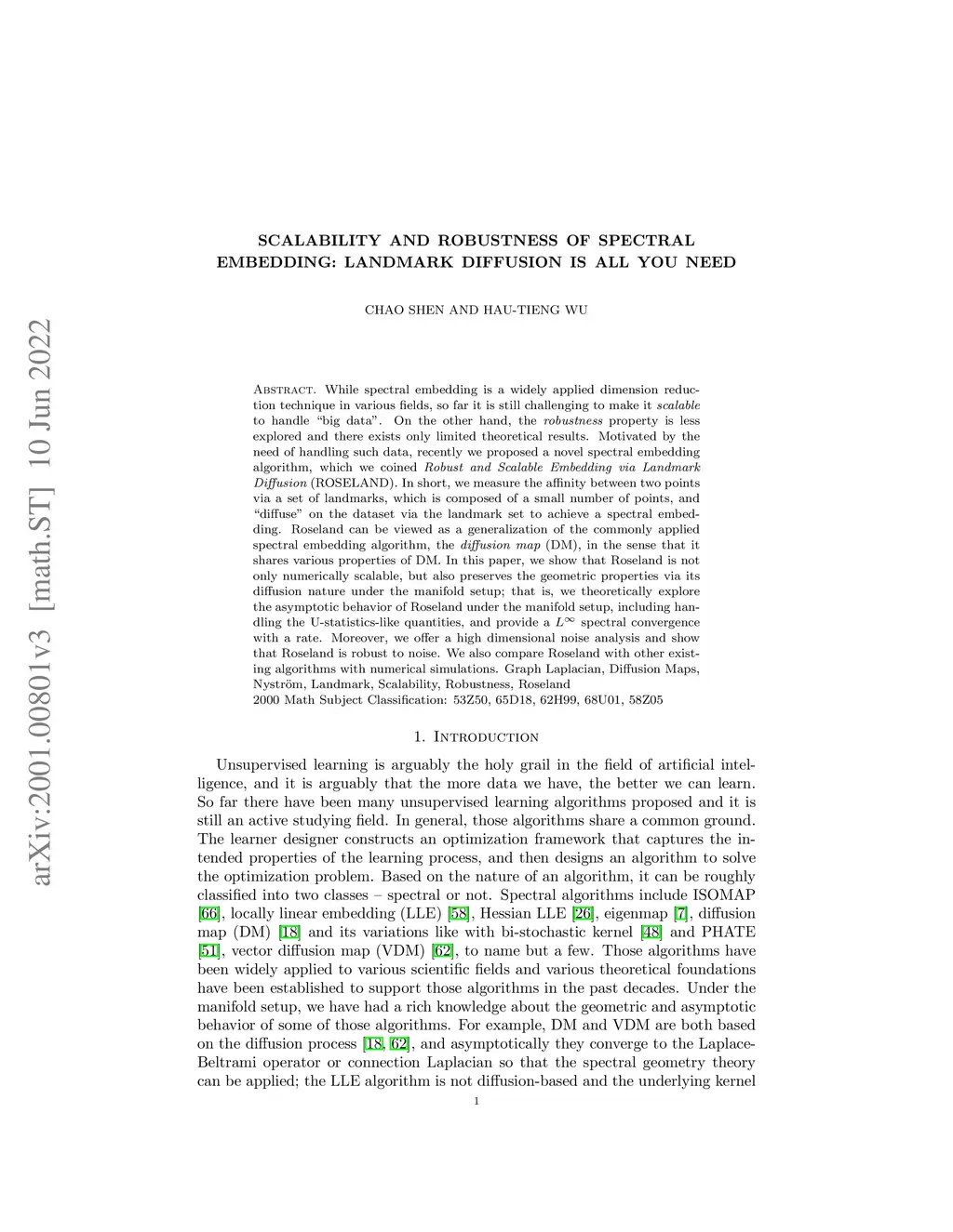 While spectral embedding is a widely applied dimension reduction technique in various fields, so far it is still challenging to make it scalable to handle ``big data''. On the other hand, the robustness property is less explored and there exists only limited theoretical results. Motivated by the need of handling such data, recently we proposed a novel spectral embedding algorithm, which we coined Robust and Scalable Embedding via Landmark Diffusion (ROSELAND). In short, we measure the affinity between two points via a set of landmarks, which is composed of a small number of points, and ``diffuse'' on the dataset via the landmark set to achieve a spectral embedding. Roseland can be viewed as a generalization of the commonly applied spectral embedding algorithm, the diffusion map (DM), in the sense that it shares various properties of DM. In this paper, we show that Roseland is not only numerically scalable, but also preserves the geometric properties via its diffusion nature under the manifold setup; that is, we theoretically explore the asymptotic behavior of Roseland under the manifold setup, including handling the U-statistics-like quantities, and provide a spectral convergence with a rate. Moreover, we offer a high dimensional noise analysis and show that Roseland is robust to noise. We also compare Roseland with other existing algorithms with numerical simulations.