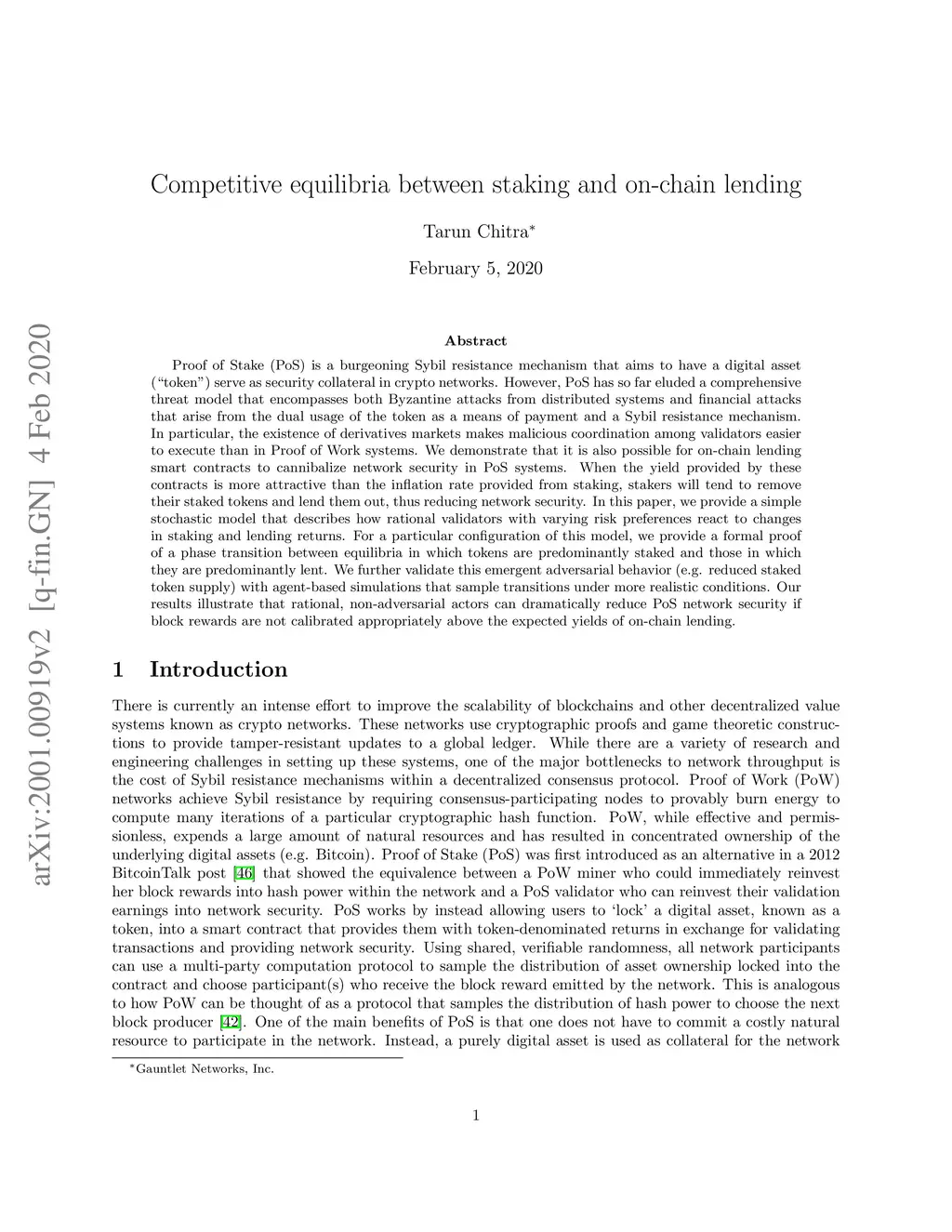 Proof of Stake (PoS) is a burgeoning Sybil resistance mechanism that aims to have a digital asset ("token") serve as security collateral in crypto networks. However, PoS has so far eluded a comprehensive threat model that encompasses both Byzantine attacks from distributed systems and financial attacks that arise from the dual usage of the token as a means of payment and a Sybil resistance mechanism. In particular, the existence of derivatives markets makes malicious coordination among validators easier to execute than in Proof of Work systems. We demonstrate that it is also possible for on-chain lending smart contracts to cannibalize network security in PoS systems. When the yield provided by these contracts is more attractive than the inflation rate provided from staking, stakers will tend to remove their staked tokens and lend them out, thus reducing network security. In this paper, we provide a simple stochastic model that describes how rational validators with varying risk preferences react to changes in staking and lending returns. For a particular configuration of this model, we provide a formal proof of a phase transition between equilibria in which tokens are predominantly staked and those in which they are predominantly lent. We further validate this emergent adversarial behavior (e.g. reduced staked token supply) with agent-based simulations that sample transitions under more realistic conditions. Our results illustrate that rational, non-adversarial actors can dramatically reduce PoS network security if block rewards are not calibrated appropriately above the expected yields of on-chain lending.