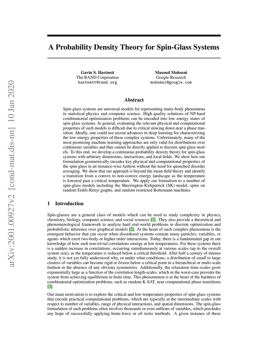 Spin-glass systems are universal models for representing many-body phenomena in statistical physics and computer science. High quality solutions of NP-hard combinatorial optimization problems can be encoded into low energy states of spin-glass systems. In general, evaluating the relevant physical and computational properties of such models is difficult due to critical slowing down near a phase transition. Ideally, one could use recent advances in deep learning for characterizing the low-energy properties of these complex systems. Unfortunately, many of the most promising machine learning approaches are only valid for distributions over continuous variables and thus cannot be directly applied to discrete spin-glass models. To this end, we develop a continuous probability density theory for spin-glass systems with arbitrary dimensions, interactions, and local fields. We show how our formulation geometrically encodes key physical and computational properties of the spin-glass in an instance-wise fashion without the need for quenched disorder averaging. We show that our approach is beyond the mean-field theory and identify a transition from a convex to non-convex energy landscape as the temperature is lowered past a critical temperature. We apply our formalism to a number of spin-glass models including the Sherrington-Kirkpatrick (SK) model, spins on random Erd\H{o}s-R\ényi graphs, and random restricted Boltzmann machines.