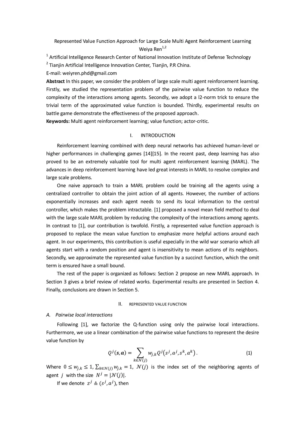 In this paper, we consider the problem of large scale multi agent reinforcement learning. Firstly, we studied the representation problem of the pairwise value function to reduce the complexity of the interactions among agents. Secondly, we adopt a l2-norm trick to ensure the trivial term of the approximated value function is bounded. Thirdly, experimental results on battle game demonstrate the effectiveness of the proposed approach.