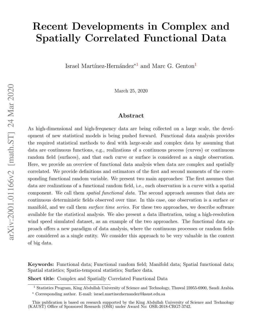 As high-dimensional and high-frequency data are being collected on a large scale, the development of new statistical models is being pushed forward. Functional data analysis provides the required statistical methods to deal with large-scale and complex data by assuming that data are continuous functions, e.g., a realization of a continuous process (curves) or continuous random fields (surfaces), and that each curve or surface is considered as a single observation. Here, we provide an overview of functional data analysis when data are complex and spatially correlated. We provide definitions and estimators of the first and second moments of the corresponding functional random variable. We present two main approaches: The first assumes that data are realizations of a functional random field, i.e., each observation is a curve with a spatial component. We call them 'spatial functional data'. The second approach assumes that data are continuous deterministic fields observed over time. In this case, one observation is a surface or manifold, and we call them 'surface time series'. For the two approaches, we describe software available for the statistical analysis. We also present a data illustration, using a high-resolution wind speed simulated dataset, as an example of the two approaches. The functional data approach offers a new paradigm of data analysis, where the continuous processes or random fields are considered as a single entity. We consider this approach to be very valuable in the context of big data.