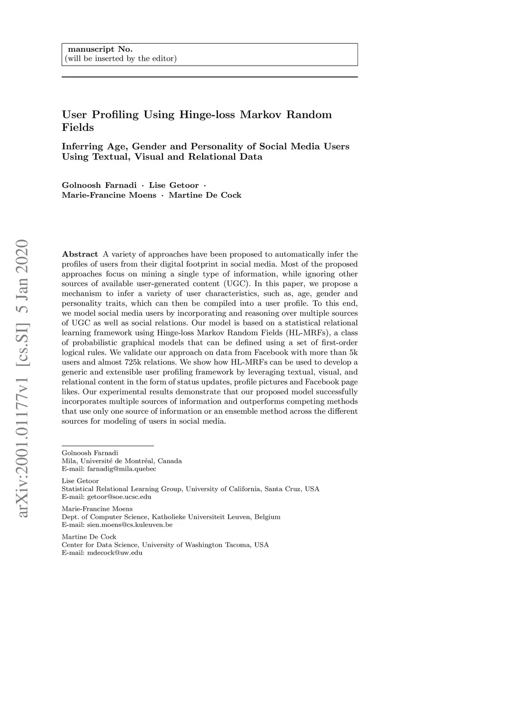 A variety of approaches have been proposed to automatically infer the profiles of users from their digital footprint in social media. Most of the proposed approaches focus on mining a single type of information, while ignoring other sources of available user-generated content (UGC). In this paper, we propose a mechanism to infer a variety of user characteristics, such as, age, gender and personality traits, which can then be compiled into a user profile. To this end, we model social media users by incorporating and reasoning over multiple sources of UGC as well as social relations. Our model is based on a statistical relational learning framework using Hinge-loss Markov Random Fields (HL-MRFs), a class of probabilistic graphical models that can be defined using a set of first-order logical rules. We validate our approach on data from Facebook with more than 5k users and almost 725k relations. We show how HL-MRFs can be used to develop a generic and extensible user profiling framework by leveraging textual, visual, and relational content in the form of status updates, profile pictures and Facebook page likes. Our experimental results demonstrate that our proposed model successfully incorporates multiple sources of information and outperforms competing methods that use only one source of information or an ensemble method across the different sources for modeling of users in social media.