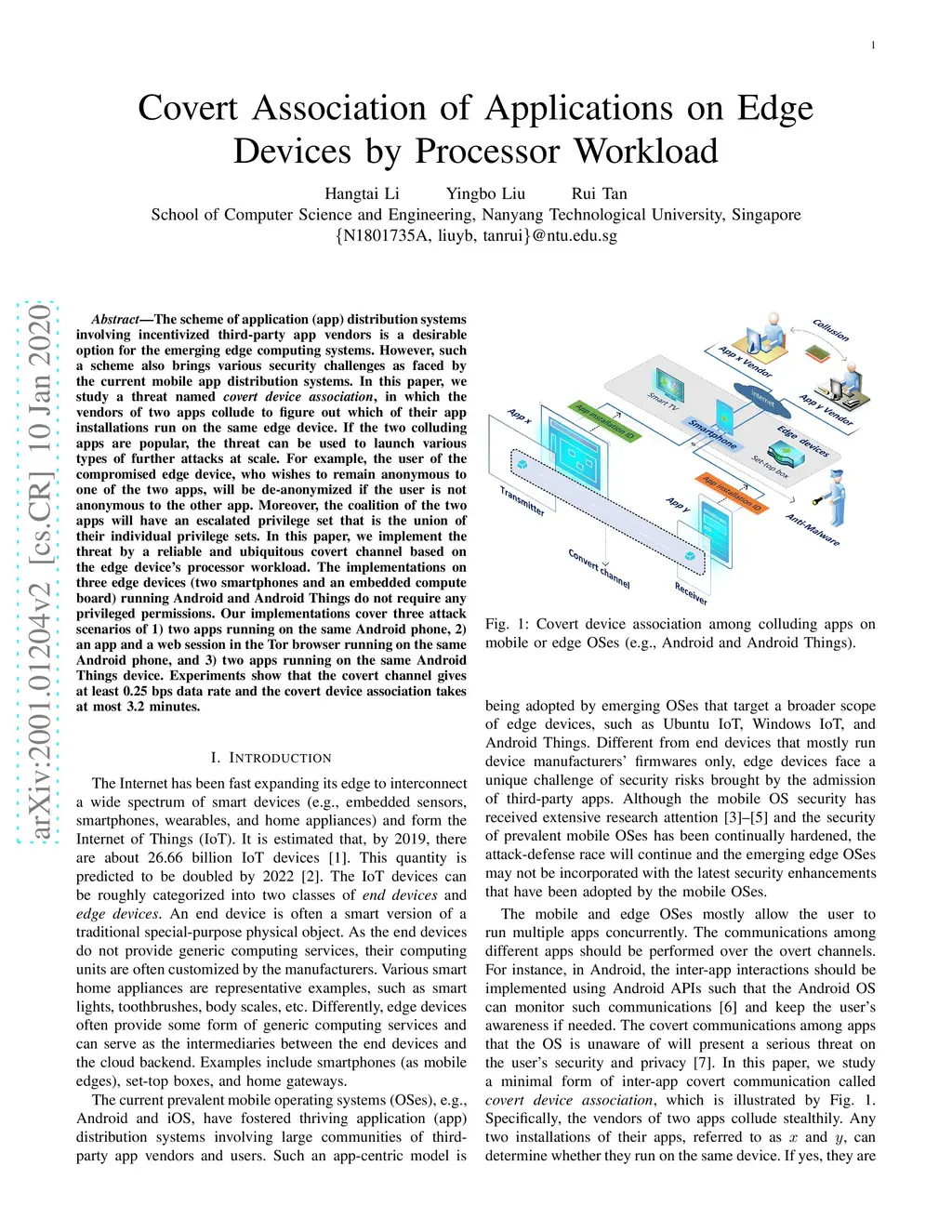 The scheme of application (app) distribution systems involving incentivized third-party app vendors is a desirable option for the emerging edge computing systems. However, such a scheme also brings various security challenges as faced by the current mobile app distribution systems. In this paper, we study a threat named covert device association, in which the vendors of two apps collude to figure out which of their app installations run on the same edge device. If the two colluding apps are popular, the threat can be used to launch various types of further attacks at scale. For example, the user of the compromised edge device, who wishes to remain anonymous to one of the two apps, will be de-anonymized if the user is not anonymous to the other app. Moreover, the coalition of the two apps will have an escalated privilege set that is the union of their individual privilege sets. In this paper, we implement the threat by a reliable and ubiquitous covert channel based on the edge device processor workload. The implementations on three edge devices (two smartphones and an embedded compute board) running Android and Android Things do not require any privileged permissions. Our implementations cover three attack scenarios of 1) two apps running on the same Android phone, 2) an app and a web session in the Tor browser running on the same Android phone, and 3) two apps running on the same Android Things device. Experiments show that the covert channel gives at least 0.25 bps data rate and the covert device association takes at most 3.2 minutes.