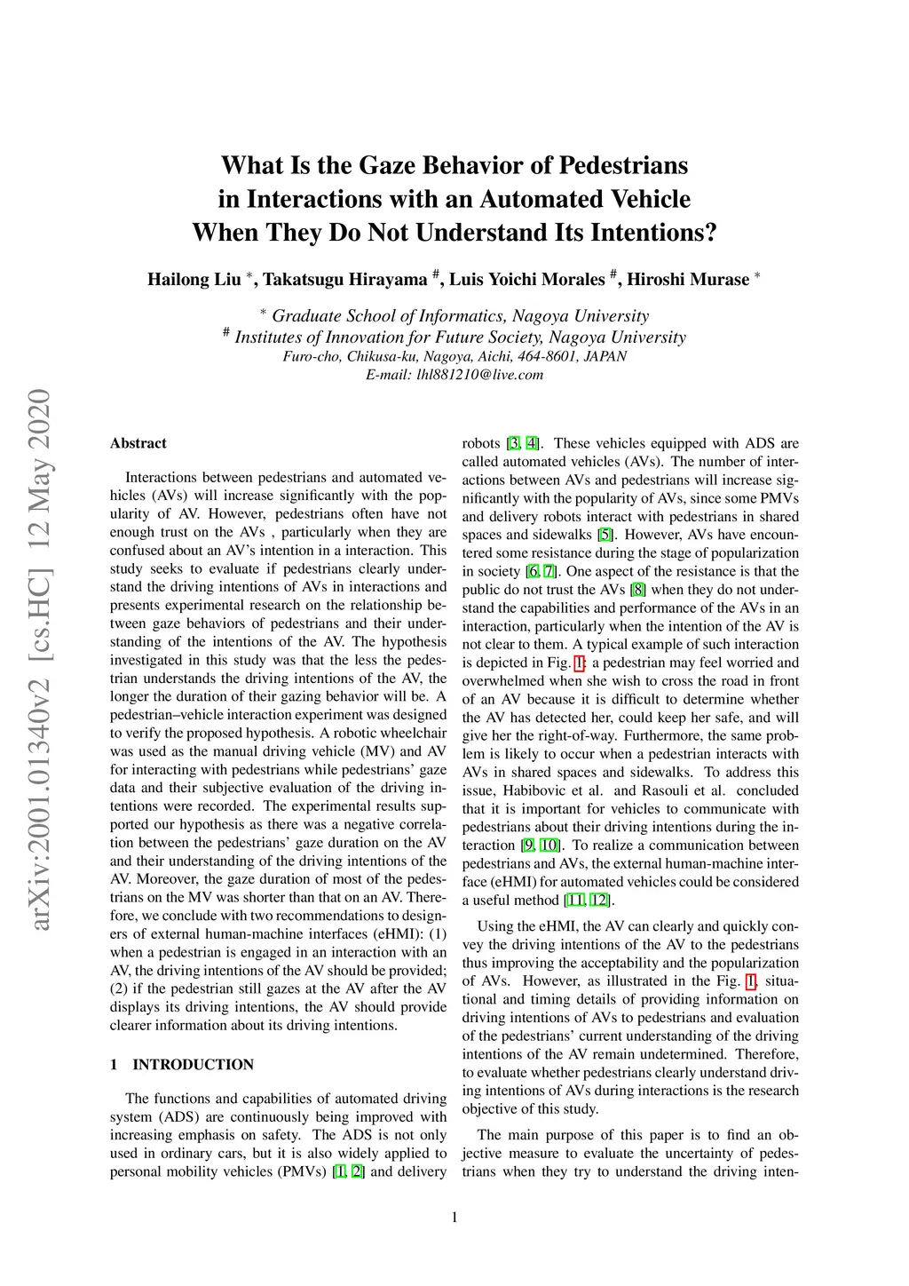 Interactions between pedestrians and automated vehicles (AVs) will increase significantly with the popularity of AV. However, pedestrians often have not enough trust on the AVs , particularly when they are confused about an AV's intention in a interaction. This study seeks to evaluate if pedestrians clearly understand the driving intentions of AVs in interactions and presents experimental research on the relationship between gaze behaviors of pedestrians and their understanding of the intentions of the AV. The hypothesis investigated in this study was that the less the pedestrian understands the driving intentions of the AV, the longer the duration of their gazing behavior will be. A pedestrian--vehicle interaction experiment was designed to verify the proposed hypothesis. A robotic wheelchair was used as the manual driving vehicle (MV) and AV for interacting with pedestrians while pedestrians' gaze data and their subjective evaluation of the driving intentions were recorded. The experimental results supported our hypothesis as there was a negative correlation between the pedestrians' gaze duration on the AV and their understanding of the driving intentions of the AV. Moreover, the gaze duration of most of the pedestrians on the MV was shorter than that on an AV. Therefore, we conclude with two recommendations to designers of external human-machine interfaces (eHMI): (1) when a pedestrian is engaged in an interaction with an AV, the driving intentions of the AV should be provided; (2) if the pedestrian still gazes at the AV after the AV displays its driving intentions, the AV should provide clearer information about its driving intentions.