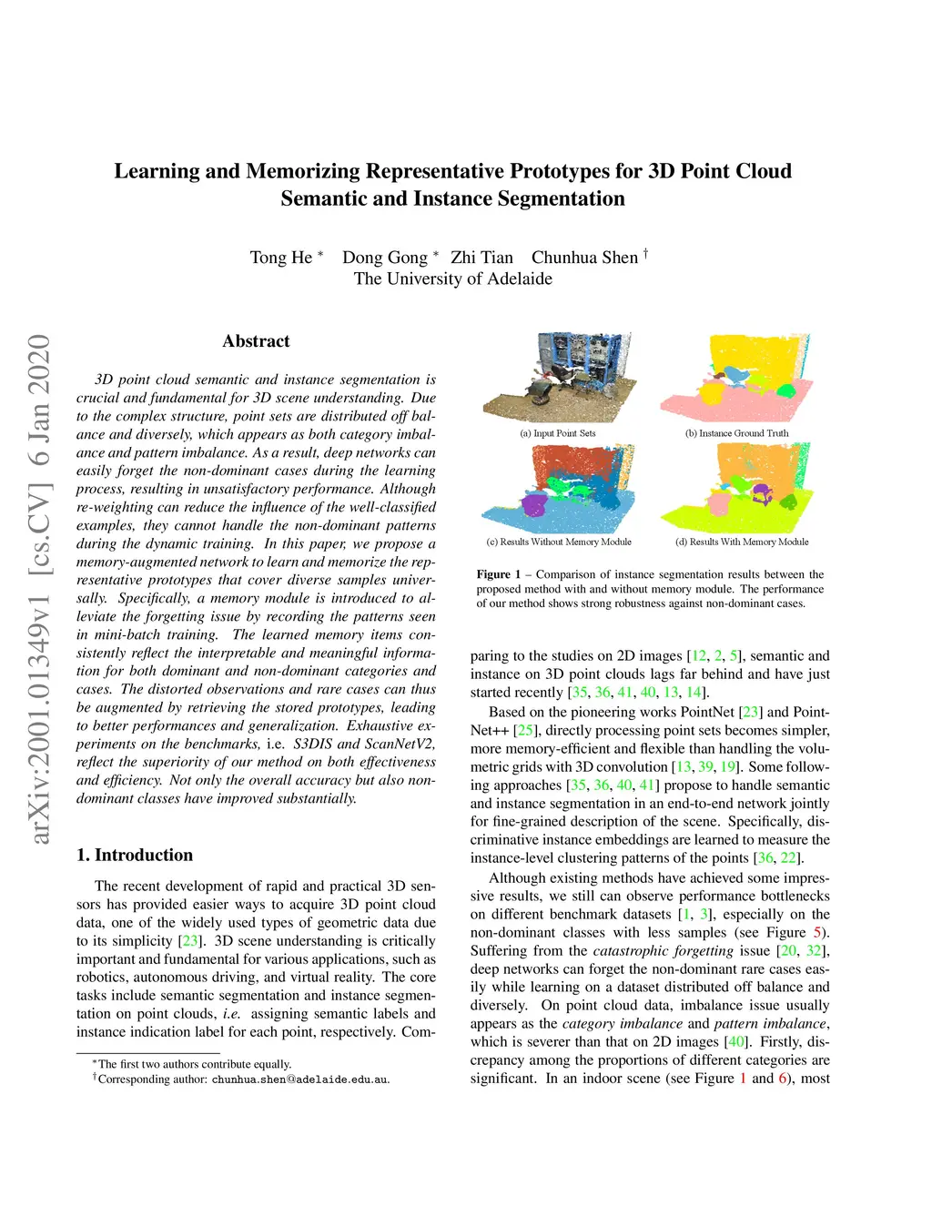 3D point cloud semantic and instance segmentation is crucial and fundamental for 3D scene understanding. Due to the complex structure, point sets are distributed off balance and diversely, which appears as both category imbalance and pattern imbalance. As a result, deep networks can easily forget the non-dominant cases during the learning process, resulting in unsatisfactory performance. Although re-weighting can reduce the influence of the well-classified examples, they cannot handle the non-dominant patterns during the dynamic training. In this paper, we propose a memory-augmented network to learn and memorize the representative prototypes that cover diverse samples universally. Specifically, a memory module is introduced to alleviate the forgetting issue by recording the patterns seen in mini-batch training. The learned memory items consistently reflect the interpretable and meaningful information for both dominant and non-dominant categories and cases. The distorted observations and rare cases can thus be augmented by retrieving the stored prototypes, leading to better performances and generalization. Exhaustive experiments on the benchmarks, i.e. S3DIS and ScanNetV2, reflect the superiority of our method on both effectiveness and efficiency. Not only the overall accuracy but also nondominant classes have improved substantially.