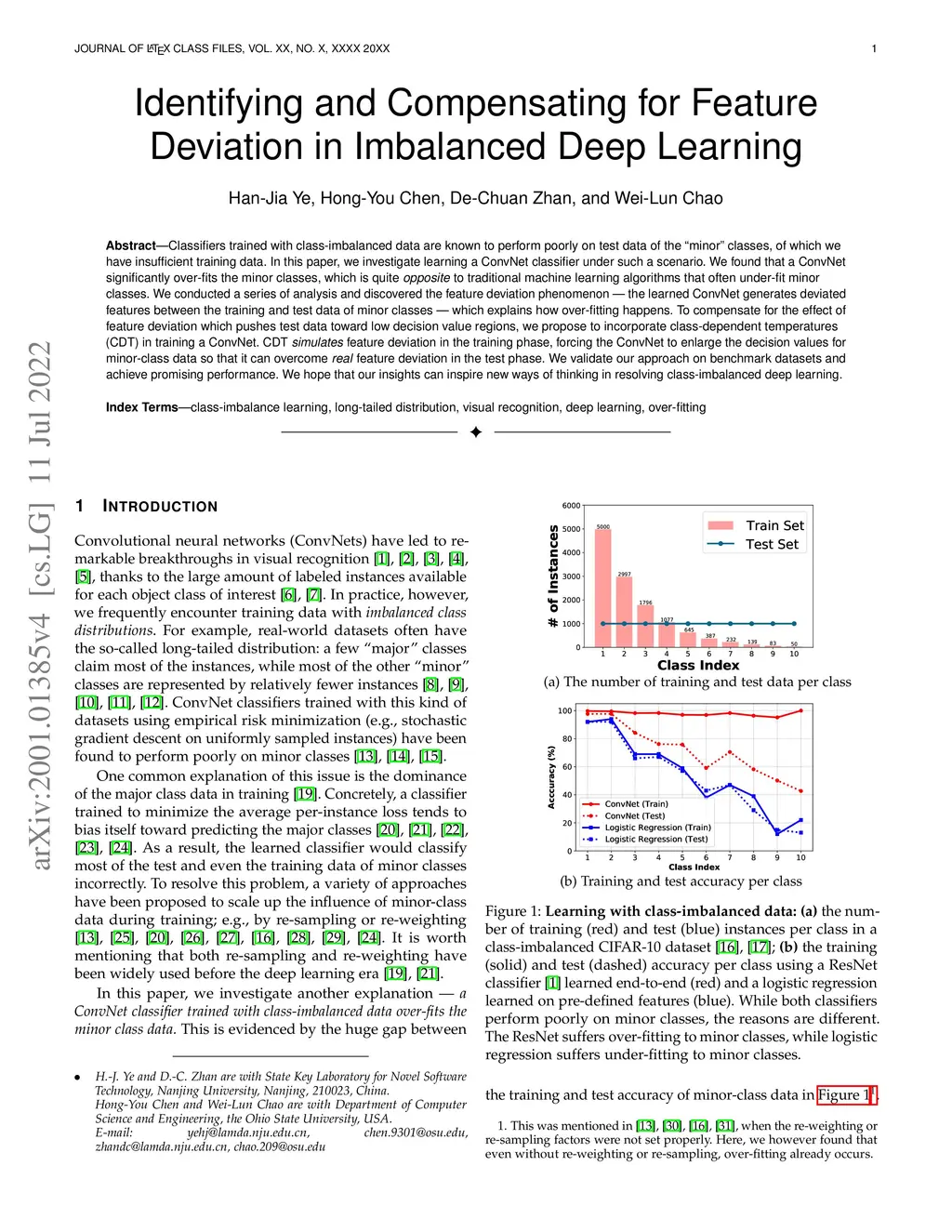 Classifiers trained with class-imbalanced data are known to perform poorly on test data of the "minor" classes, of which we have insufficient training data. In this paper, we investigate learning a ConvNet classifier under such a scenario. We found that a ConvNet significantly over-fits the minor classes, which is quite opposite to traditional machine learning algorithms that often under-fit minor classes. We conducted a series of analysis and discovered the feature deviation phenomenon -- the learned ConvNet generates deviated features between the training and test data of minor classes -- which explains how over-fitting happens. To compensate for the effect of feature deviation which pushes test data toward low decision value regions, we propose to incorporate class-dependent temperatures (CDT) in training a ConvNet. CDT simulates feature deviation in the training phase, forcing the ConvNet to enlarge the decision values for minor-class data so that it can overcome real feature deviation in the test phase. We validate our approach on benchmark datasets and achieve promising performance. We hope that our insights can inspire new ways of thinking in resolving class-imbalanced deep learning.