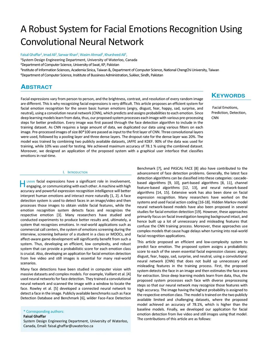 Facial expressions vary from person to person, and the brightness, contrast, and resolution of every random image are different. This is why recognizing facial expressions is very difficult. This article proposes an efficient system for facial emotion recognition for the seven basic human emotions (angry, disgust, fear, happy, sad, surprise, and neutral), using a convolution neural network (CNN), which predicts and assigns probabilities to each emotion. Since deep learning models learn from data, thus, our proposed system processes each image with various pre-processing steps for better prediction. Every image was first passed through the face detection algorithm to include in the training dataset. As CNN requires a large amount of data, we duplicated our data using various filters on each image. Pre-processed images of size 80*100 are passed as input to the first layer of CNN. Three convolutional layers were used, followed by a pooling layer and three dense layers. The dropout rate for the dense layer was 20%. The model was trained by combining two publicly available datasets, JAFFE and KDEF. 90% of the data was used for training, while 10% was used for testing. We achieved maximum accuracy of 78.1 % using the combined dataset. Moreover, we designed an application of the proposed system with a graphical user interface that classifies emotions in real-time.