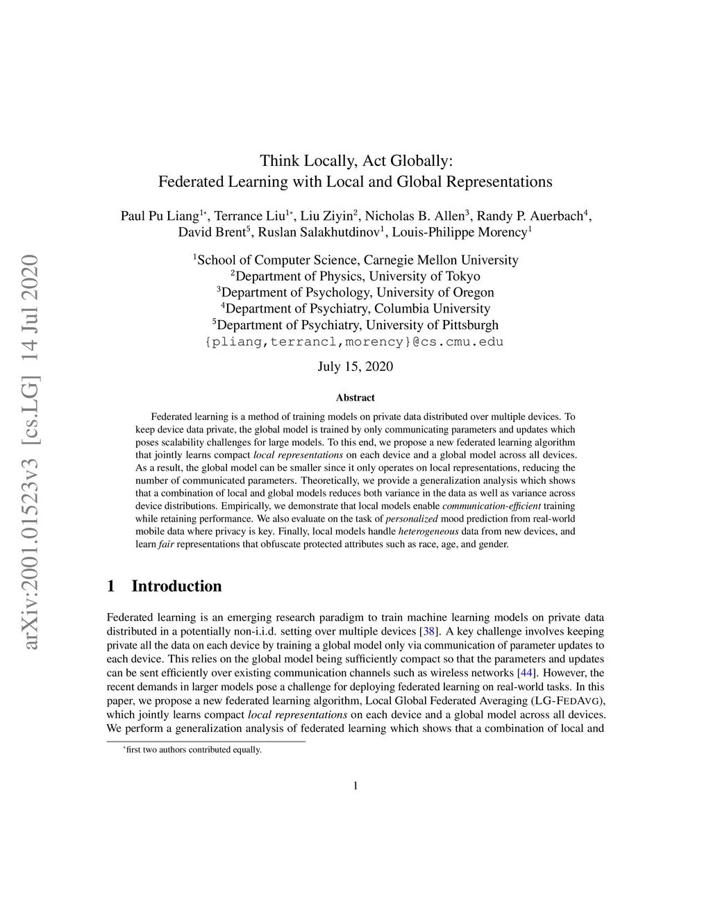 Federated learning is a method of training models on private data distributed over multiple devices. To keep device data private, the global model is trained by only communicating parameters and updates which poses scalability challenges for large models. To this end, we propose a new federated learning algorithm that jointly learns compact local representations on each device and a global model across all devices. As a result, the global model can be smaller since it only operates on local representations, reducing the number of communicated parameters. Theoretically, we provide a generalization analysis which shows that a combination of local and global models reduces both variance in the data as well as variance across device distributions. Empirically, we demonstrate that local models enable communication-efficient training while retaining performance. We also evaluate on the task of personalized mood prediction from real-world mobile data where privacy is key. Finally, local models handle heterogeneous data from new devices, and learn fair representations that obfuscate protected attributes such as race, age, and gender.