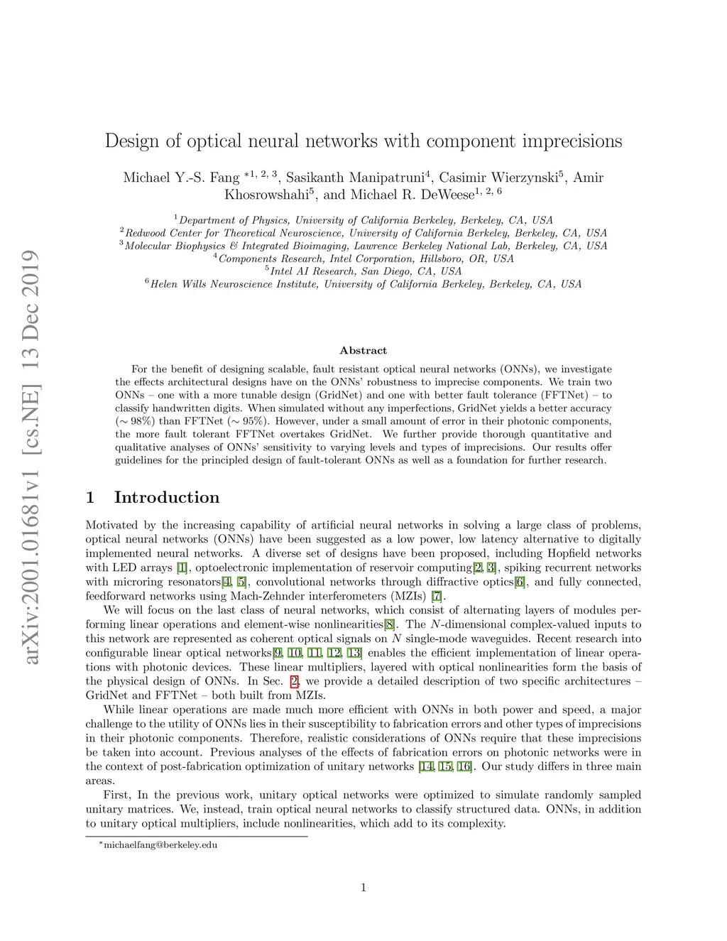 For the benefit of designing scalable, fault resistant optical neural networks (ONNs), we investigate the effects architectural designs have on the ONNs' robustness to imprecise components. We train two ONNs -- one with a more tunable design (GridNet) and one with better fault tolerance (FFTNet) -- to classify handwritten digits. When simulated without any imperfections, GridNet yields a better accuracy (~98%) than FFTNet (~95%). However, under a small amount of error in their photonic components, the more fault tolerant FFTNet overtakes GridNet. We further provide thorough quantitative and qualitative analyses of ONNs' sensitivity to varying levels and types of imprecisions. Our results offer guidelines for the principled design of fault-tolerant ONNs as well as a foundation for further research.