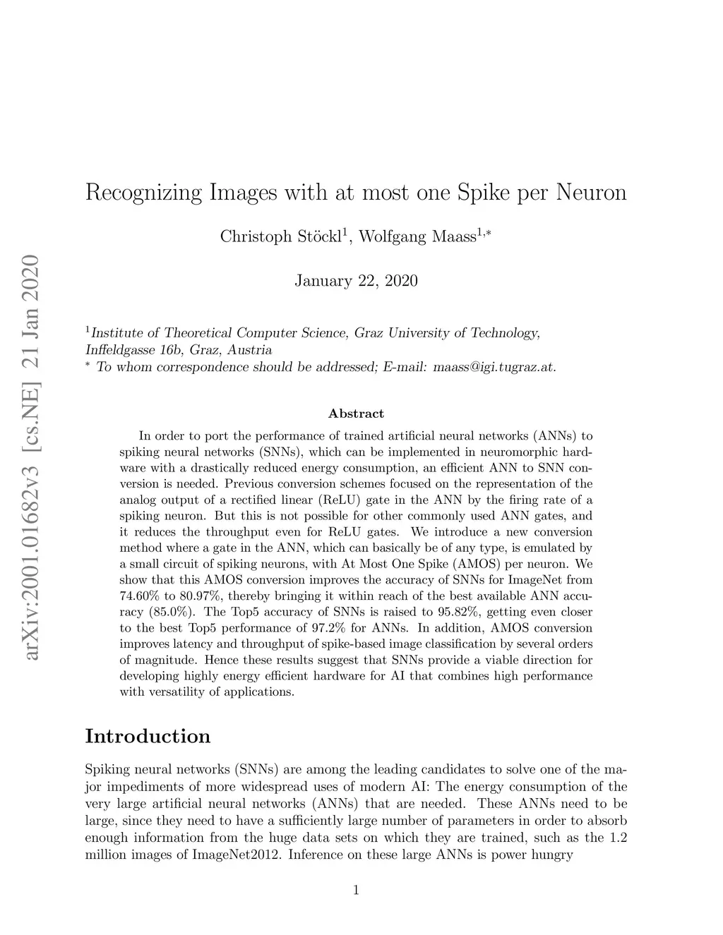 In order to port the performance of trained artificial neural networks (ANNs) to spiking neural networks (SNNs), which can be implemented in neuromorphic hardware with a drastically reduced energy consumption, an efficient ANN to SNN conversion is needed. Previous conversion schemes focused on the representation of the analog output of a rectified linear (ReLU) gate in the ANN by the firing rate of a spiking neuron. But this is not possible for other commonly used ANN gates, and it reduces the throughput even for ReLU gates. We introduce a new conversion method where a gate in the ANN, which can basically be of any type, is emulated by a small circuit of spiking neurons, with At Most One Spike (AMOS) per neuron. We show that this AMOS conversion improves the accuracy of SNNs for ImageNet from 74.60% to 80.97%, thereby bringing it within reach of the best available ANN accuracy (85.0%). The Top5 accuracy of SNNs is raised to 95.82%, getting even closer to the best Top5 performance of 97.2% for ANNs. In addition, AMOS conversion improves latency and throughput of spike-based image classification by several orders of magnitude. Hence these results suggest that SNNs provide a viable direction for developing highly energy efficient hardware for AI that combines high performance with versatility of applications.