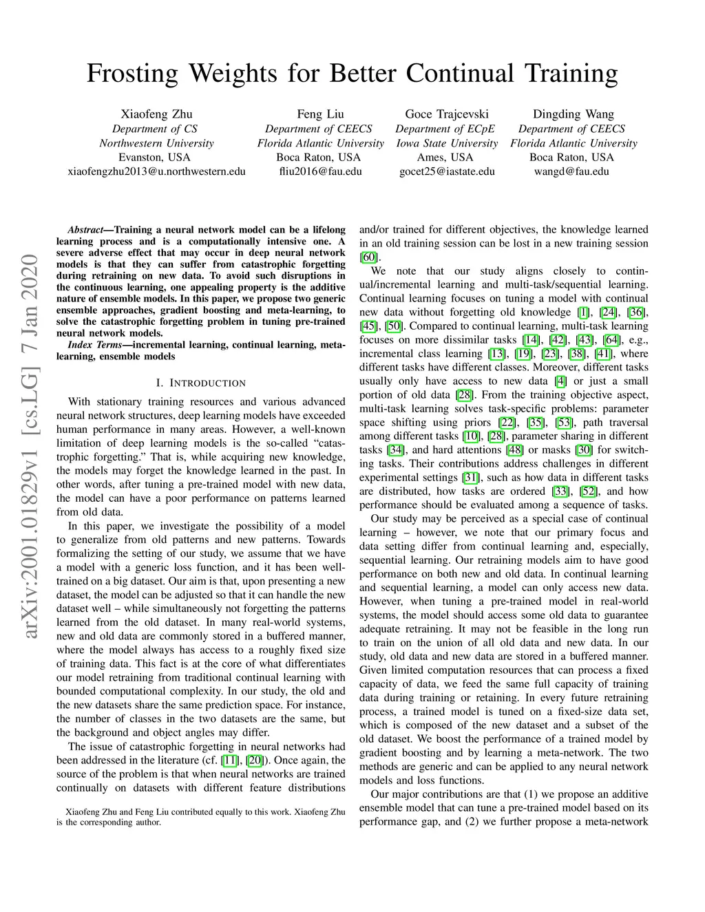 Training a neural network model can be a lifelong learning process and is a computationally intensive one. A severe adverse effect that may occur in deep neural network models is that they can suffer from catastrophic forgetting during retraining on new data. To avoid such disruptions in the continuous learning, one appealing property is the additive nature of ensemble models. In this paper, we propose two generic ensemble approaches, gradient boosting and meta-learning, to solve the catastrophic forgetting problem in tuning pre-trained neural network models.