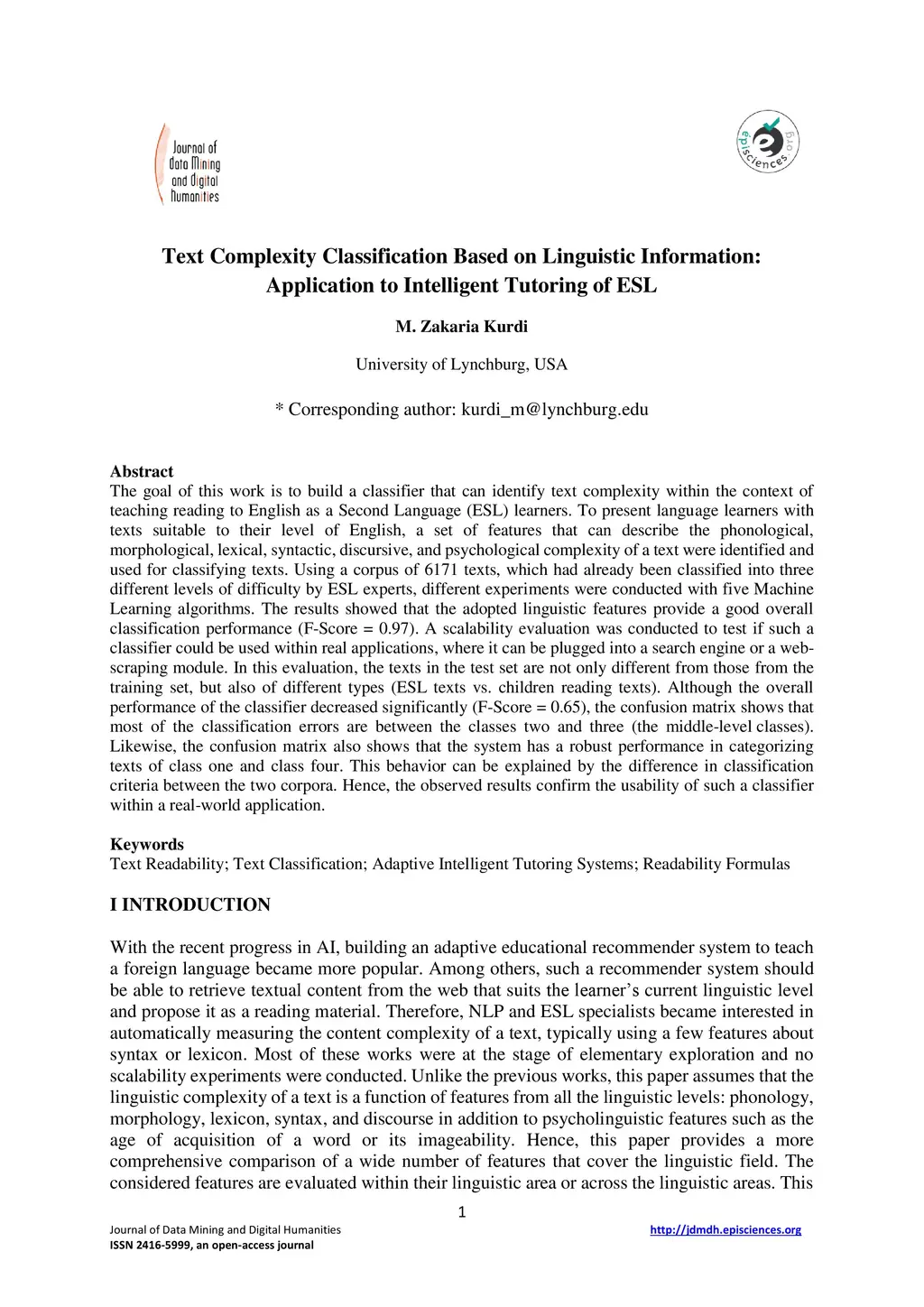 The goal of this work is to build a classifier that can identify text complexity within the context of teaching reading to English as a Second Language (ESL) learners. To present language learners with texts that are suitable to their level of English, a set of features that can describe the phonological, morphological, lexical, syntactic, discursive, and psychological complexity of a given text were identified. Using a corpus of 6171 texts, which had already been classified into three different levels of difficulty by ESL experts, different experiments were conducted with five machine learning algorithms. The results showed that the adopted linguistic features provide a good overall classification performance (F-Score = 0.97). A scalability evaluation was conducted to test if such a classifier could be used within real applications, where it can be, for example, plugged into a search engine or a web-scraping module. In this evaluation, the texts in the test set are not only different from those from the training set but also of different types (ESL texts vs. children reading texts). Although the overall performance of the classifier decreased significantly (F-Score = 0.65), the confusion matrix shows that most of the classification errors are between the classes two and three (the middle-level classes) and that the system has a robust performance in categorizing texts of class one and four. This behavior can be explained by the difference in classification criteria between the two corpora. Hence, the observed results confirm the usability of such a classifier within a real-world application.