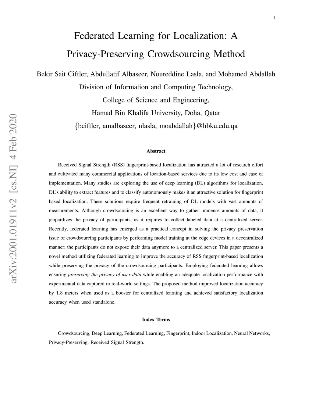 Received Signal Strength (RSS) fingerprint-based localization has attracted a lot of research effort and cultivated many commercial applications of location-based services due to its low cost and ease of implementation. Many studies are exploring the use of deep learning (DL) algorithms for localization. DL's ability to extract features and to classify autonomously makes it an attractive solution for fingerprint-based localization. These solutions require frequent retraining of DL models with vast amounts of measurements. Although crowdsourcing is an excellent way to gather immense amounts of data, it jeopardizes the privacy of participants, as it requires to collect labeled data at a centralized server. Recently, federated learning has emerged as a practical concept in solving the privacy preservation issue of crowdsourcing participants by performing model training at the edge devices in a decentralized manner; the participants do not expose their data anymore to a centralized server. This paper presents a novel method utilizing federated learning to improve the accuracy of RSS fingerprint-based localization while preserving the privacy of the crowdsourcing participants. Employing federated learning allows ensuring \emph{preserving the privacy of user data} while enabling an adequate localization performance with experimental data captured in real-world settings. The proposed method improved localization accuracy by 1.8 meters when used as a booster for centralized learning and achieved satisfactory localization accuracy when used standalone.