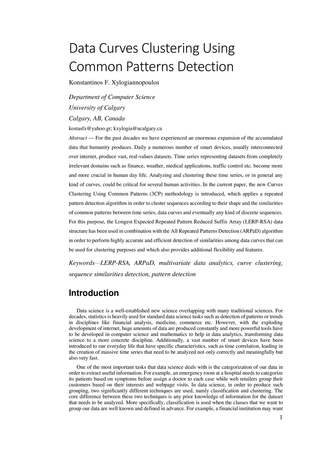 For the past decades we have experienced an enormous expansion of the accumulated data that humanity produces. Daily a numerous number of smart devices, usually interconnected over internet, produce vast, real-values datasets. Time series representing datasets from completely irrelevant domains such as finance, weather, medical applications, traffic control etc. become more and more crucial in human day life. Analyzing and clustering these time series, or in general any kind of curves, could be critical for several human activities. In the current paper, the new Curves Clustering Using Common Patterns (3CP) methodology is introduced, which applies a repeated pattern detection algorithm in order to cluster sequences according to their shape and the similarities of common patterns between time series, data curves and eventually any kind of discrete sequences. For this purpose, the Longest Expected Repeated Pattern Reduced Suffix Array (LERP-RSA) data structure has been used in combination with the All Repeated Patterns Detection (ARPaD) algorithm in order to perform highly accurate and efficient detection of similarities among data curves that can be used for clustering purposes and which also provides additional flexibility and features.