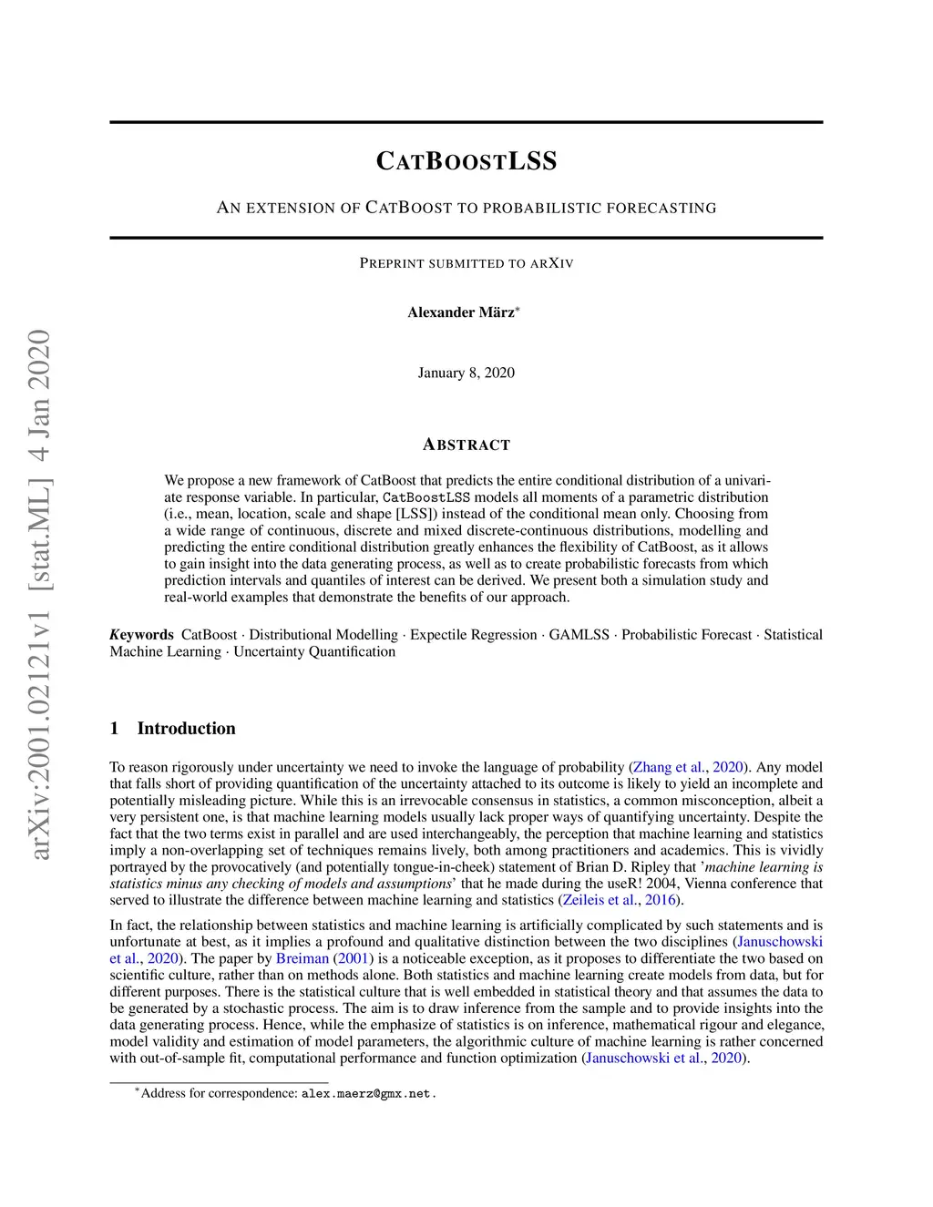 We propose a new framework of CatBoost that predicts the entire conditional distribution of a univariate response variable. In particular, CatBoostLSS models all moments of a parametric distribution (i.e., mean, location, scale and shape [LSS]) instead of the conditional mean only. Choosing from a wide range of continuous, discrete and mixed discrete-continuous distributions, modelling and predicting the entire conditional distribution greatly enhances the flexibility of CatBoost, as it allows to gain insight into the data generating process, as well as to create probabilistic forecasts from which prediction intervals and quantiles of interest can be derived. We present both a simulation study and real-world examples that demonstrate the benefits of our approach.