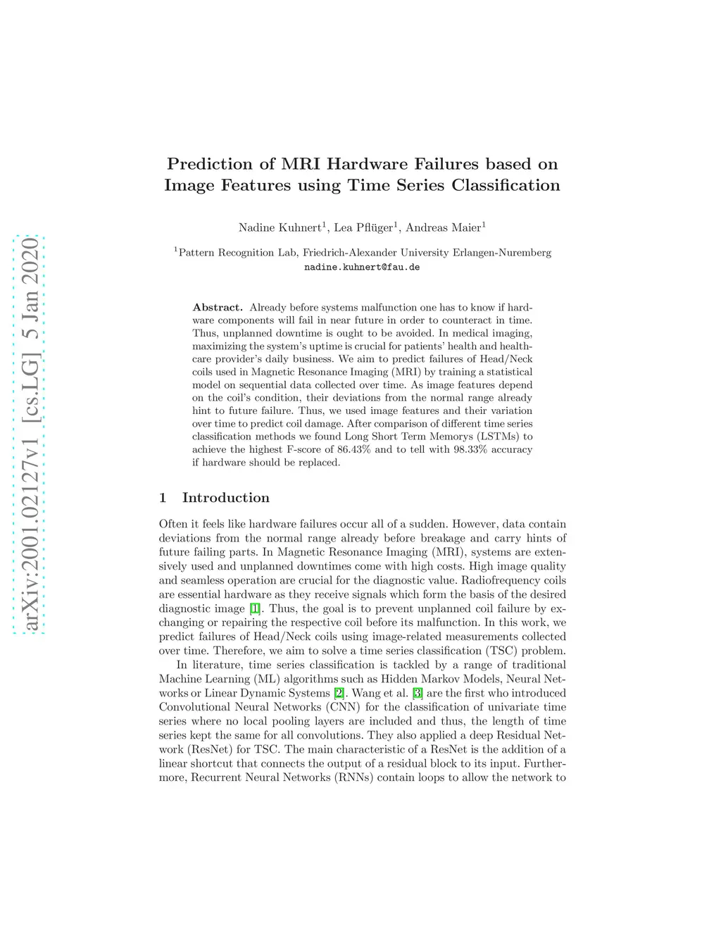 Already before systems malfunction one has to know if hardware components will fail in near future in order to counteract in time. Thus, unplanned downtime is ought to be avoided. In medical imaging, maximizing the system's uptime is crucial for patients' health and healthcare provider's daily business. We aim to predict failures of Head/Neck coils used in Magnetic Resonance Imaging (MRI) by training a statistical model on sequential data collected over time. As image features depend on the coil's condition, their deviations from the normal range already hint to future failure. Thus, we used image features and their variation over time to predict coil damage. After comparison of different time series classification methods we found Long Short Term Memorys (LSTMs) to achieve the highest F-score of 86.43% and to tell with 98.33% accuracy if hardware should be replaced.