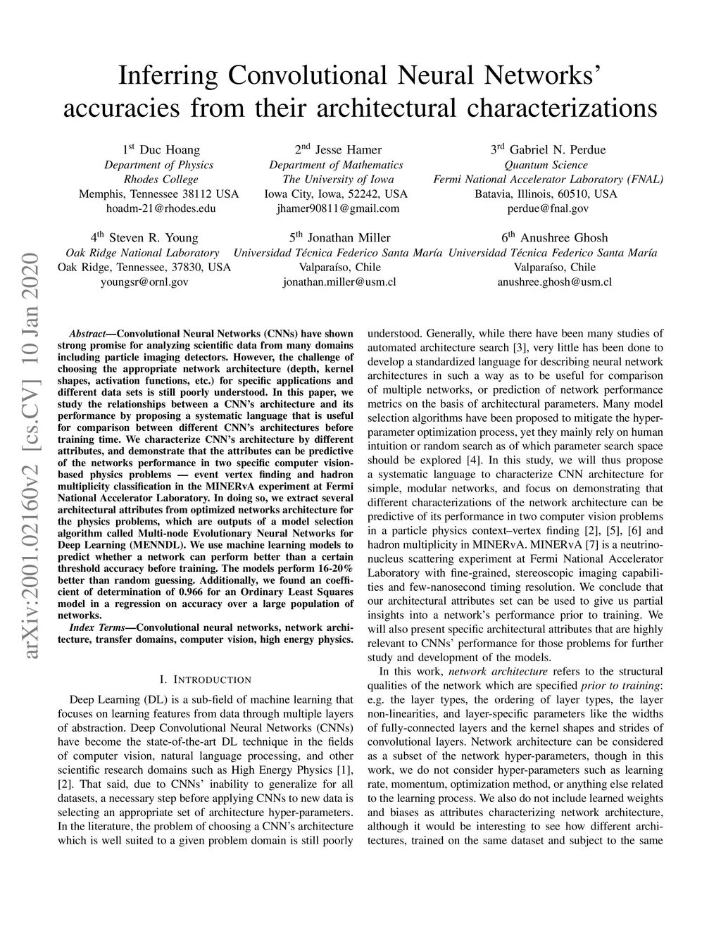 Convolutional Neural Networks (CNNs) have shown strong promise for analyzing scientific data from many domains including particle imaging detectors. However, the challenge of choosing the appropriate network architecture (depth, kernel shapes, activation functions, etc.) for specific applications and different data sets is still poorly understood. In this paper, we study the relationships between a CNN's architecture and its performance by proposing a systematic language that is useful for comparison between different CNN's architectures before training time. We characterize CNN's architecture by different attributes, and demonstrate that the attributes can be predictive of the networks' performance in two specific computer vision-based physics problems -- event vertex finding and hadron multiplicity classification in the MINERvA experiment at Fermi National Accelerator Laboratory. In doing so, we extract several architectural attributes from optimized networks' architecture for the physics problems, which are outputs of a model selection algorithm called Multi-node Evolutionary Neural Networks for Deep Learning (MENNDL). We use machine learning models to predict whether a network can perform better than a certain threshold accuracy before training. The models perform 16-20% better than random guessing. Additionally, we found an coefficient of determination of 0.966 for an Ordinary Least Squares model in a regression on accuracy over a large population of networks.