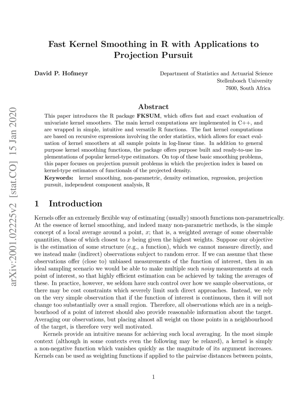 This paper introduces the R package FKSUM, which offers fast and exact evaluation of univariate kernel smoothers. The main kernel computations are implemented in C++, and are wrapped in simple, intuitive and versatile R functions. The fast kernel computations are based on recursive expressions involving the order statistics, which allows for exact evaluation of kernel smoothers at all sample points in log-linear time. In addition to general purpose kernel smoothing functions, the package offers purpose built and ready-to-use implementations of popular kernel-type estimators. On top of these basic smoothing problems, this paper focuses on projection pursuit problems in which the projection index is based on kernel-type estimators of functionals of the projected density.