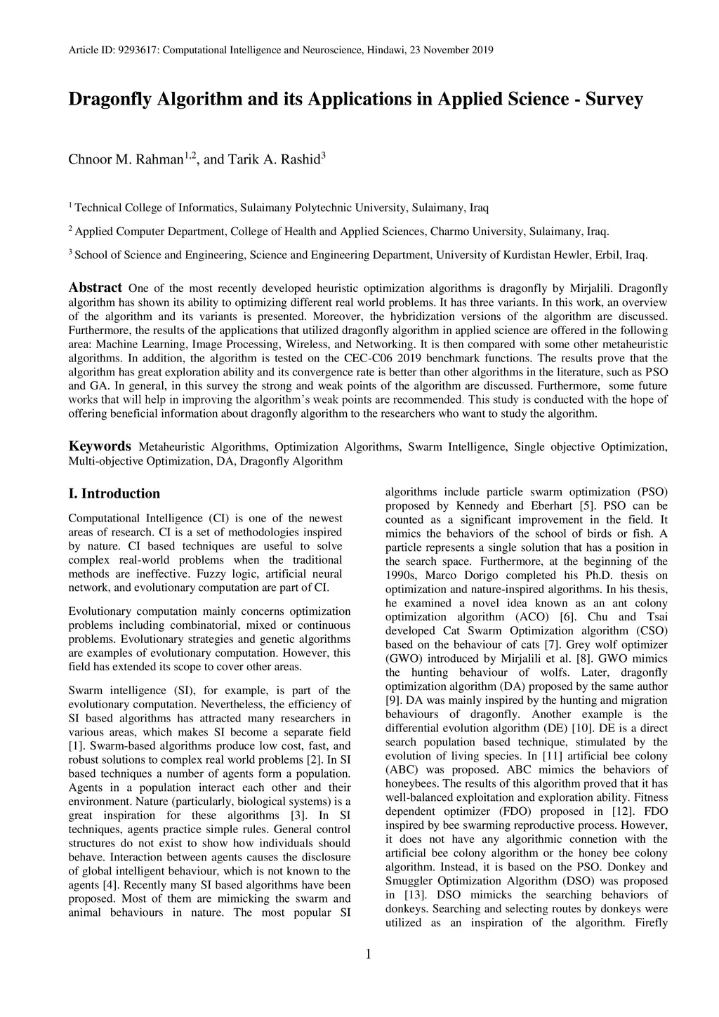 Dragonfly Algorithm and its Applications in Applied Science -- Survey